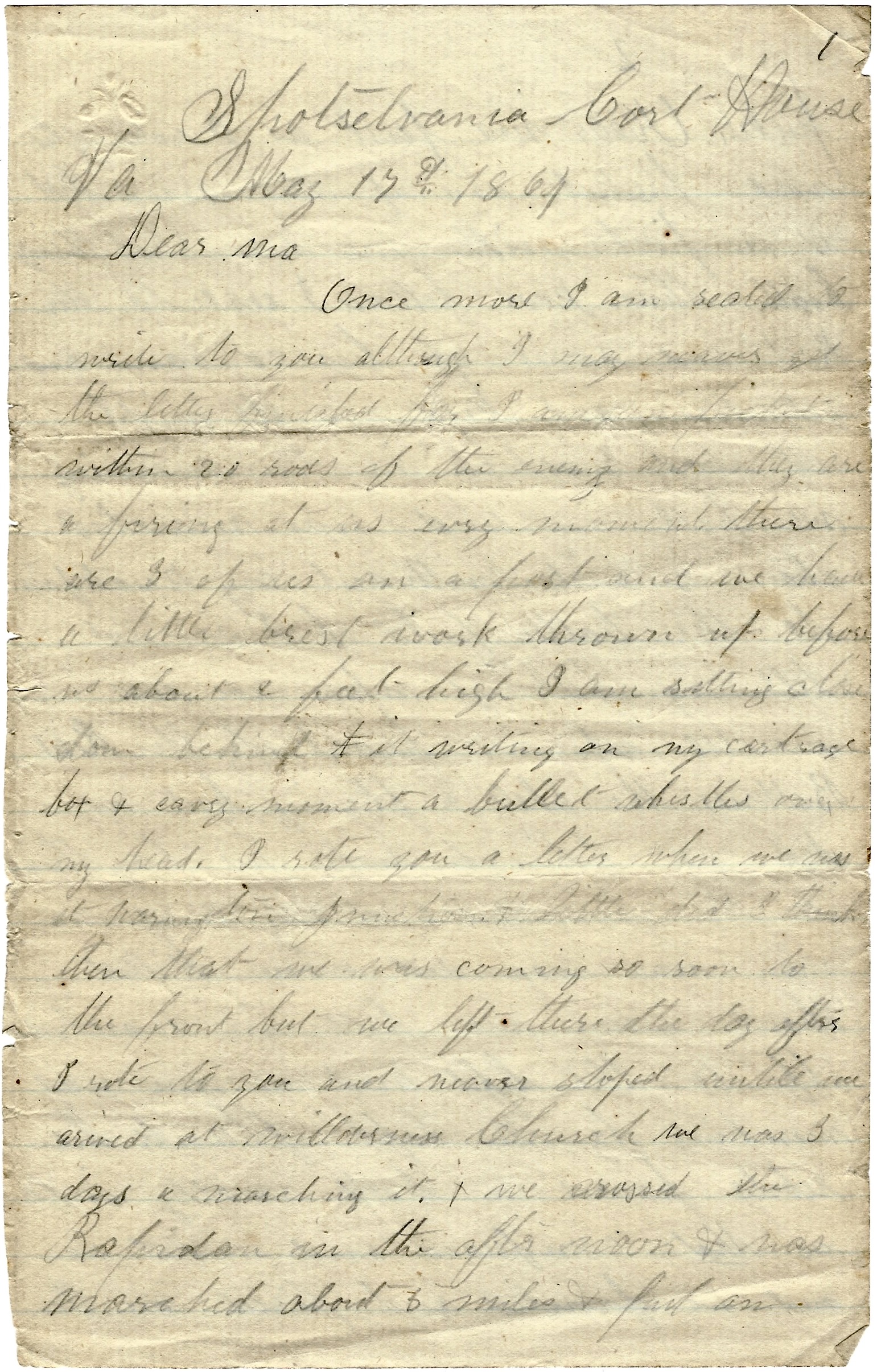 After I got to this regiment, we started right out on the march from a place called Brandy Station and marched 3 days and 2 nights when we got out to where the Battle of the Wilderness was, in time to get into that the second day of the fight. And we have been right in the front line of battle about all the time up to this place where we now are. If not in one battle that was going on, it was on the skirmish line in another. So you can judge for yourselves whether I have seen and realized any of the hardships of this summer’s campaign.