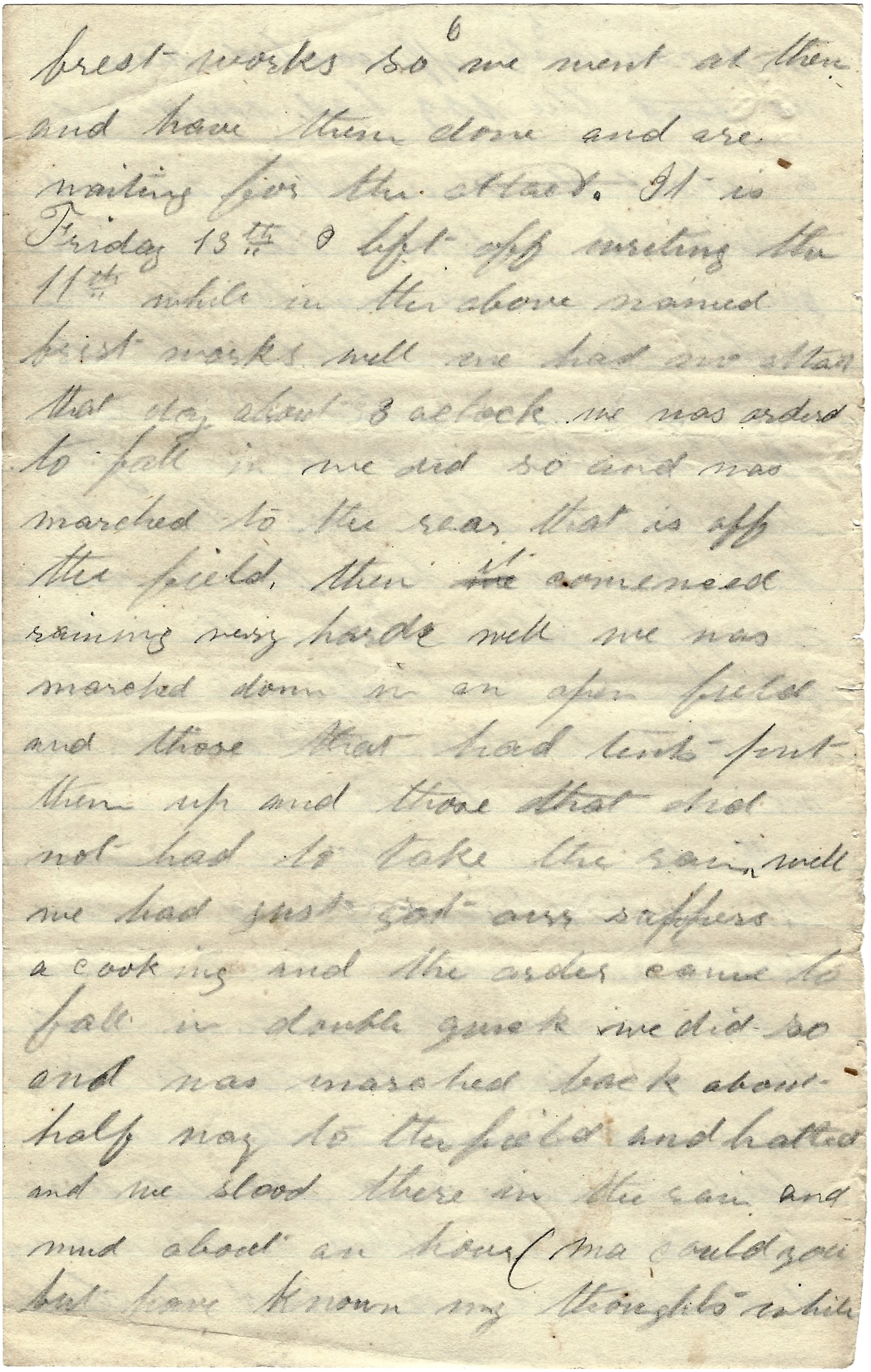 We was called up at two o’clock. It rained like shot. My blanket was wet and my feet too. We got ready in a short time and marched two hours. We halted and stacked our arms. There was a house nearby and some outbuilding (some General’s headquarters). We had got to have some wood (there was a guard around the buildings). There was no wood near so they commenced pulling down the barn and hog pen. They stripped them pretty quick. There was 50 or 60 fires started in a short time. They hadn’t got fairly to going before the order came to put them all out. If we didn’t, the shells would be a flying around us. I thought we must be amongst them for we heard the picket firing plain when daylight came. We could see our line of works plain.