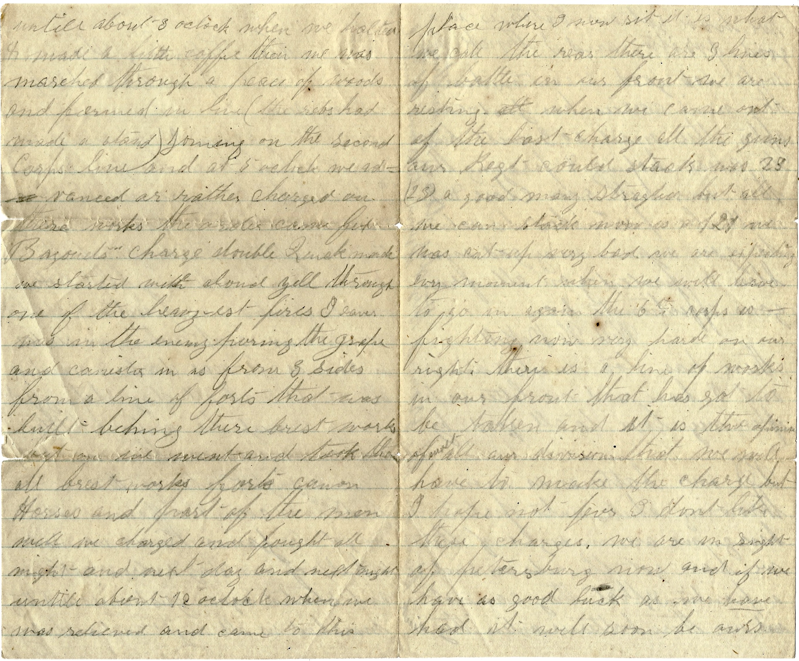 Our regiment was out on the extreme skirmish line all day yesterday and day before yesterday our Corps made a charge on the Johnnies and drove them from their breast works and drove them away from the railroad that runs into Petersburg. And we hold it yet.