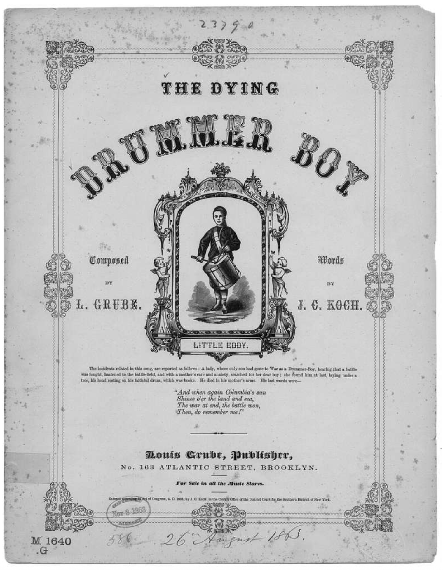 I have been very bust since my return in making out the muster rolls and settling up all the men’s accounts that we might have no delay in case they should muster us out. I completed all my returns this morning and I shall now have it easier again. There was but little done about here yesterday as most of the prominent men in the city went to Gettysburg. The Freedmen had quite a large celebration in the town and another smaller one at Freedmen’s Village. By a special invitation the Chaplain and myself attended the latter. The day passed off very pleasantly and we had a splendid time. I will enclose a leaf and petal of a flower from the old home of Gen. Lee at Arlington.