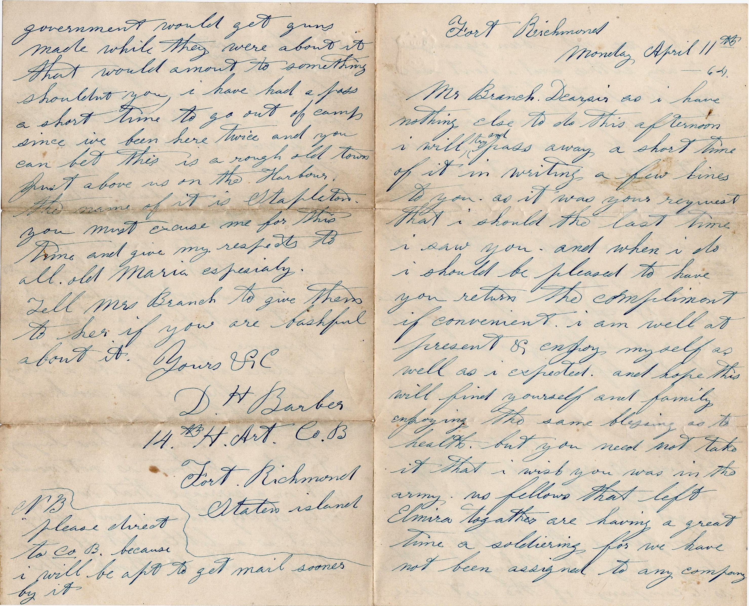 I have had a pass a short time to go out of camp since we been here twice and you can bet this is a rough old town just above us on the harbor. The name of it is Stapleton. You must excuse me for this time and give my respects to all—old Maria especially. Tell Mrs. Branch to give them to her if you are bashful about it. Yours, &c. — D. H. Barber, 14th H. Artillery, Co. B, Fort Richmond, Staten Island