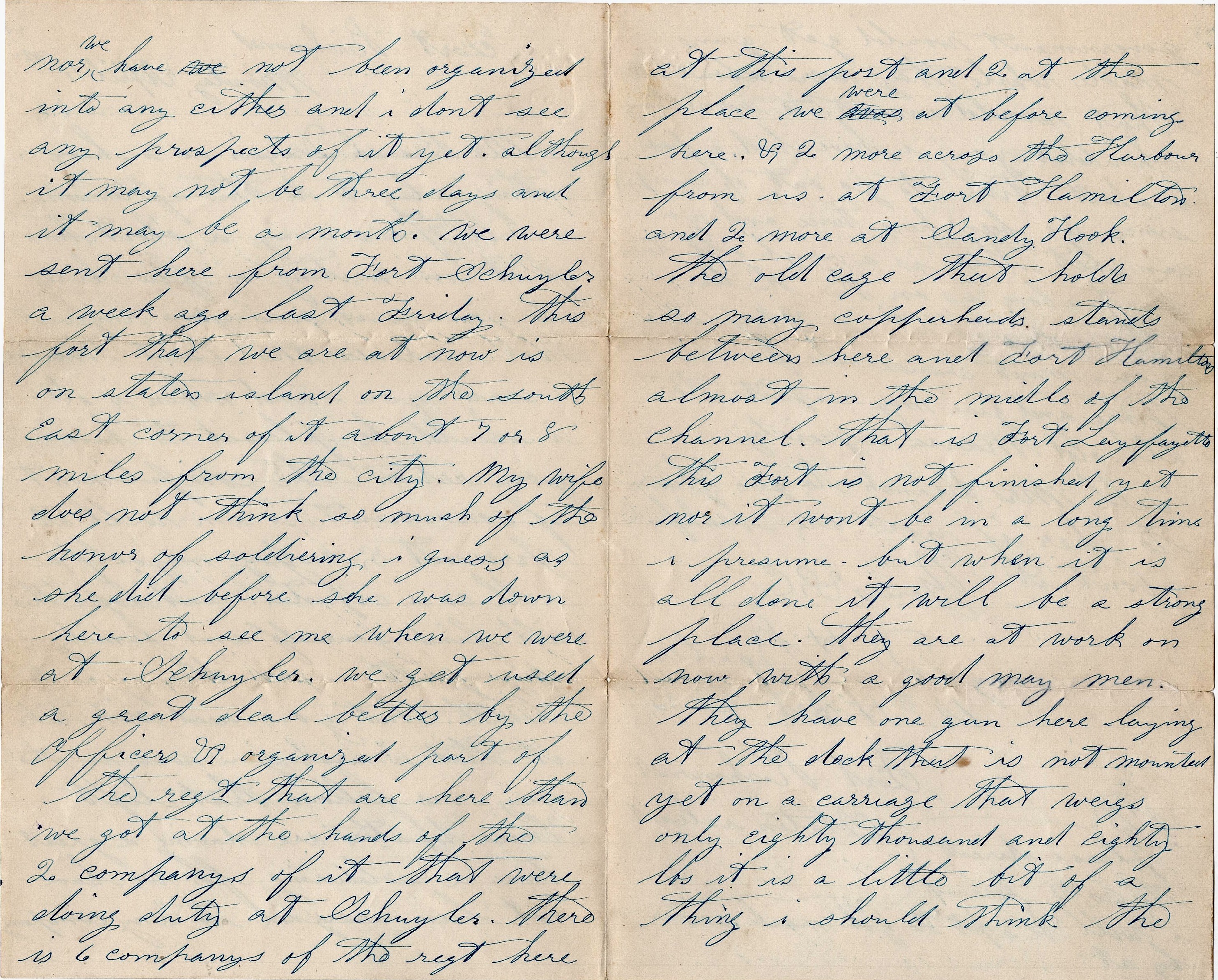 We were sent here from Fort Schuyler a week ago last Friday. This fort that we are at now is on Staten Island on the southeast corner of it, about 7 or 8 miles from the City. My wife does not think so much of the honor of soldiering I guess as she did before she was down here to see me when we were at Schuyler. We get used a great deal better by the officers & organized part of the regiment that are here than we got at the hands of the two companies of it that were doing duty at Schuyler. There is six companies of the regiment here at this post and two at the place we were at before coming here. And [there are] two more across the Harbor from us at Fort Hamilton and two more at Sandy Hook.