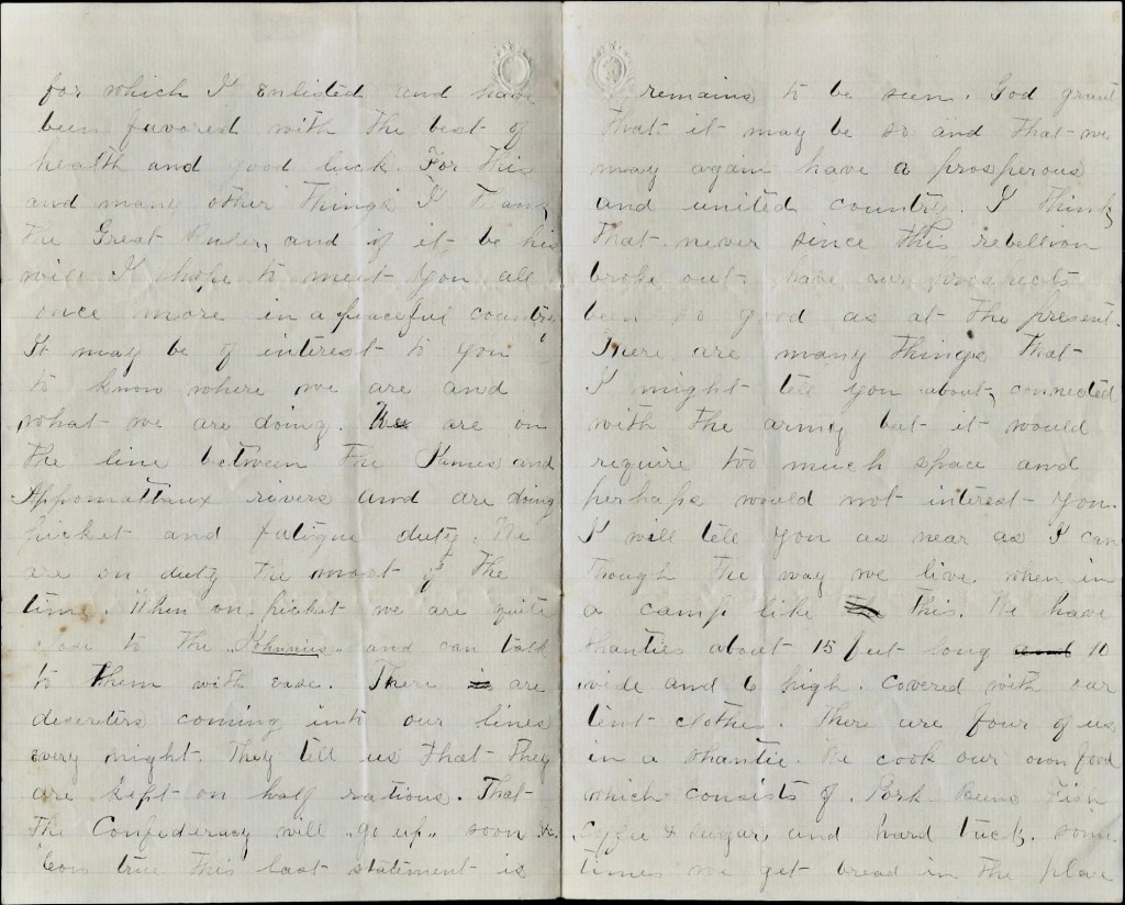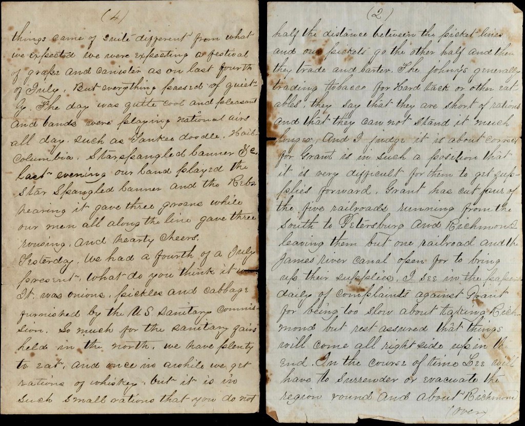 For the last week things have been very quiet in our front. The pickets of both sides seem to be taking a good rest. The pickets are very sociable with one another. The Rebs come half the distance between the picket lines and our pickets go the other half and then they trade and barter—the Johnnies generally trading tobacco for hard tack or other eatables. They say that they are short of rations and that they can not stand it much longer. And I judge it is about correct for Grant is in such a position that it is very difficult for them to get supplies forward. Grant has cut four of the five railroads running from the south to Petersburg and Richmond leaving them but one railroad and the James River canal open for to bring up their supplies. I see in the papers daily of complaints against Grant for being too slow about taking Richmond but rest assured that things will come out all right side up in the end. In the course of time, Lee will have to surrender or evacuate the region round and about Richmond and go farther south, and if he gets started once, we will take him much faster than he will like to go.