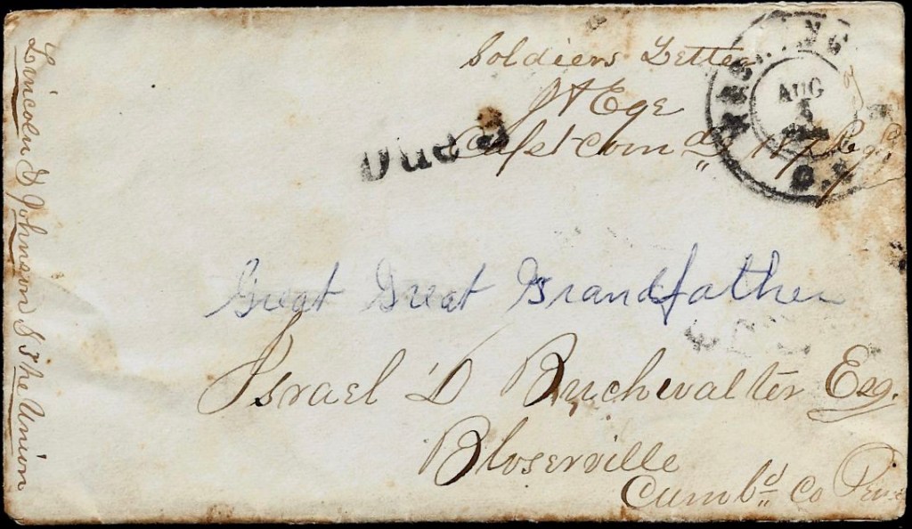 Addressed to Israel D. Buchwalter, Esq., Bloserville, Cumberland county, Penn. “Lincoln & Johnson & the Union” [Not sure if envelope goes with letter.]