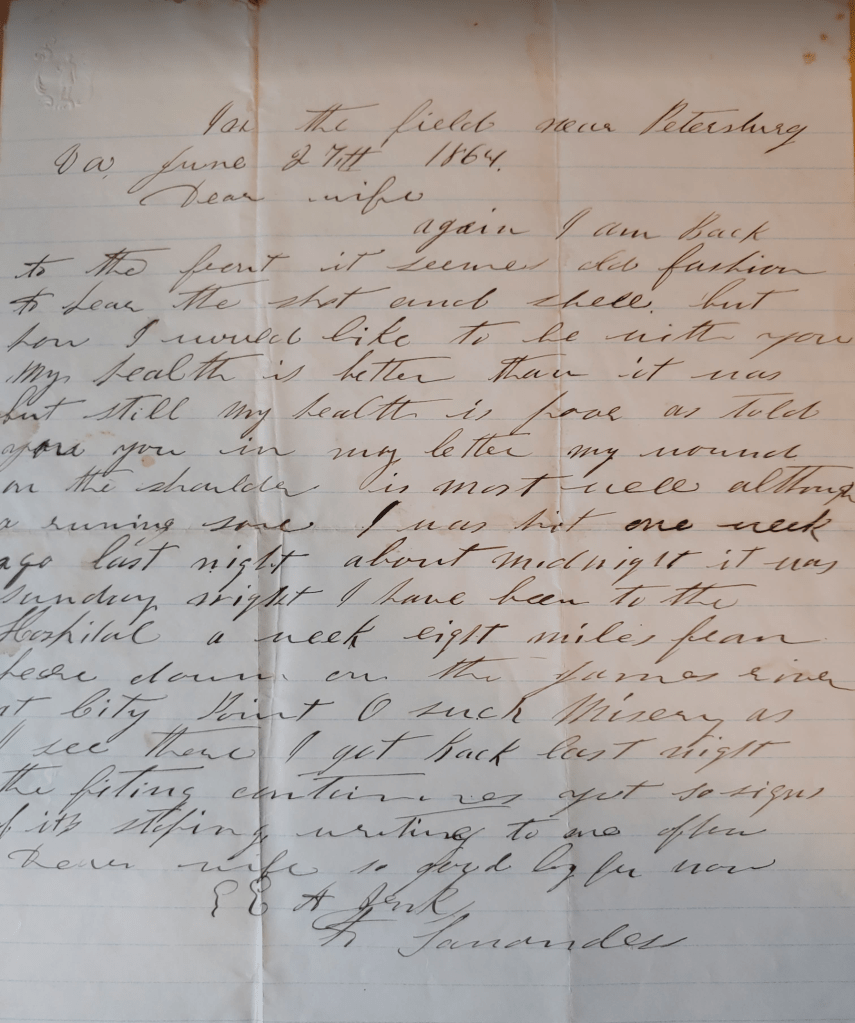 Again I am back to the front. It seems old fashion to hear the shot and shell but how I would like to be with you. My health is better than it was but still my health is poor. As told you in my letter, my wound on the shoulder is most well although a running sore. I was hit one week ago last night about midnight. It was Sunday night. I have been to the hospital a week eight miles from here down on the James river at City Point. Oh! such misery as I see there. I got back last night. The fighting continues yet. No signs of it stopping. Write to me often, dear wife.