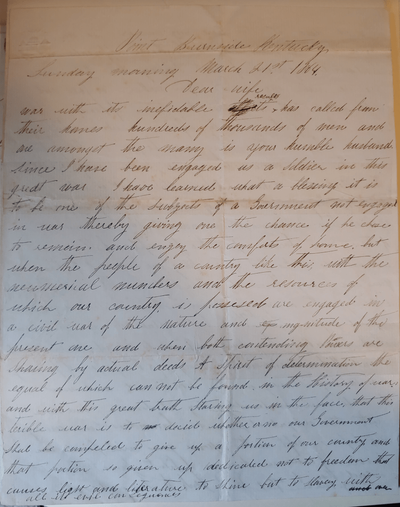 War with its inevitable results has called from their homes hundreds of thousands of men and are amongst the many is your humble husband. Since I have been engaged as a soldier in this great war, I have learned what a blessing it is to be one of the subjects of a government not engaged in war, thereby giving one the chance if he chose to remain and enjoy the comforts of home. But when the people of a country like this—with the numerical numbers and the resources of which our country is possessed—are engaged in a civil war of the nature and magnitude of the present one, and when both contending powers are sharing by actual deeds a spirit of determination the equal of which cannot be found in the history of war, and with this great truth staring us in the face that the terrible war is to decide whether or no our government shall be compelled to give up a portion of our country and that portion so given up dedicated not to [a] freedom that causes light and literature to shine, but to slavery with all its evil consequences, [I ask you,] does it stop here? My answer is no.