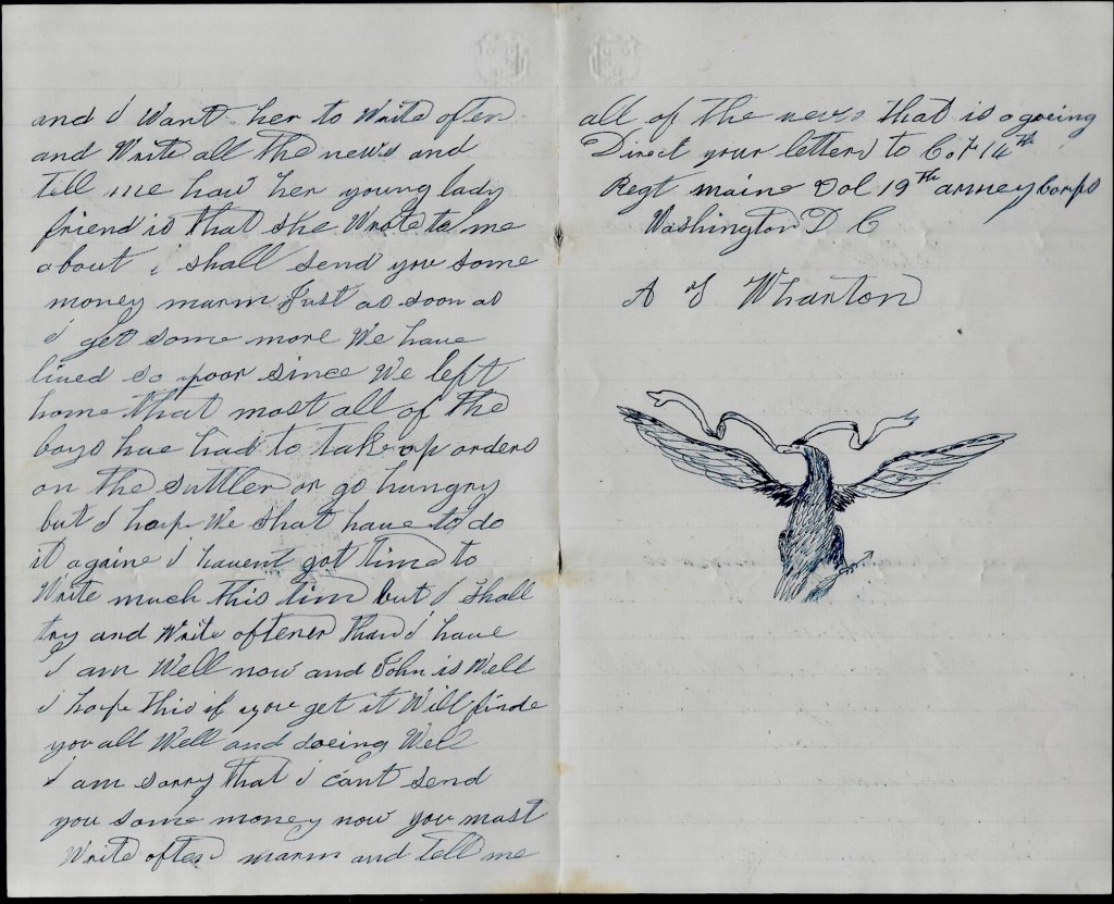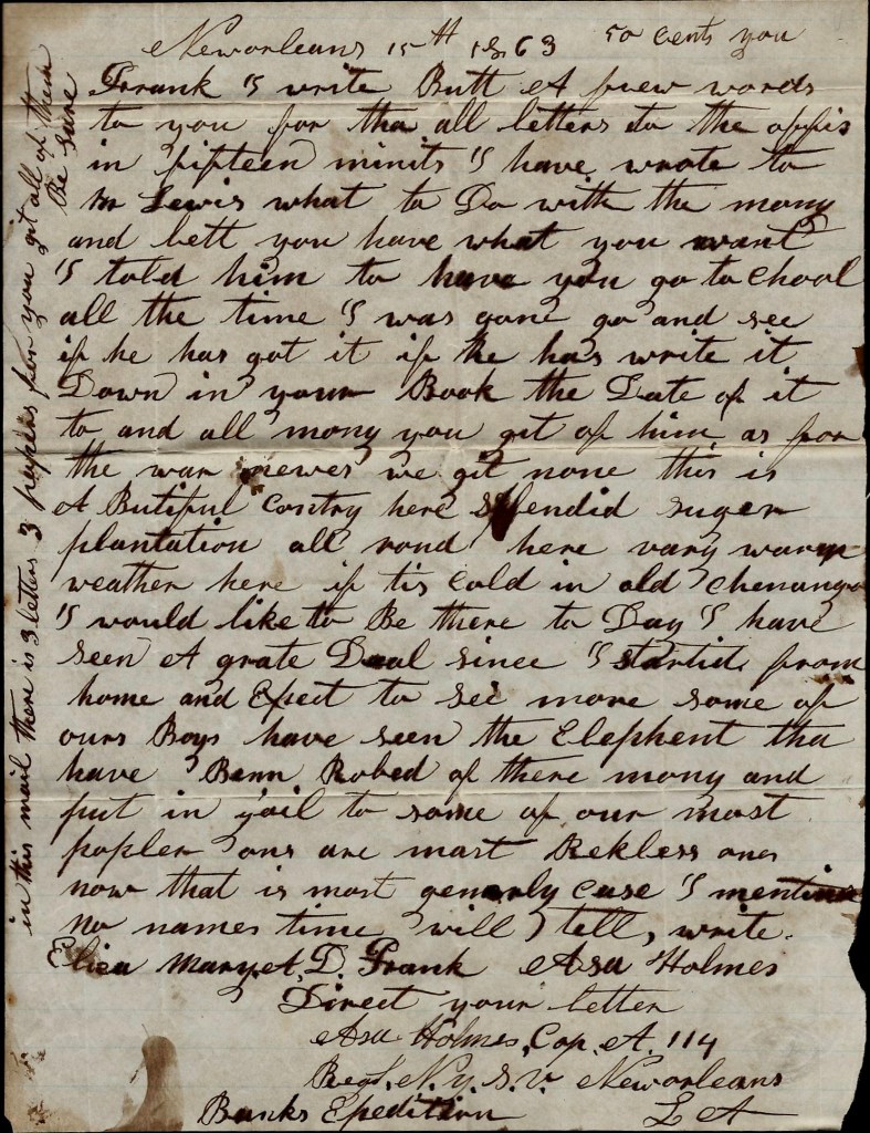 The 42nd Massachusetts is encamped about a galf a mile from us. A company of this regiment were captured by the Rebels at Galveston Texas. About all the regiments here are being paid off but I don’t think we shall get any money until we get with the rest of our regiment although we hsave been mustered for pay. For my part, I shoiuld like to get hold of some green backs as I am dead broke and when you send me the next letter, I want you to send me some money if you think it is safe to send it in a letter. Some of the Boys have had money sent them in letters and they have all got it.