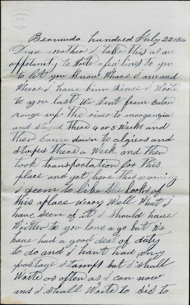 I wrote you last stating the trip that we had when we marched up to Port Hudson by land and ow I will give you an account of the trip up [by] river. We left Baton Rouge on the 14th [should be 18th] at about three o’clock in the afternoon on the steamboat Morning Light and we all thought that we had to see some fighting but as luck would have it the next morning we found ourselves in middle of a Rebel Colonel’s plantation stuck fast in the mud where the levy had been cut away and river flowed [over] the land. We stopped in this place until 12 o’clock the next day when we got off and continued our course up the river and landed on the Rebel General Winter’s plantation [four miles below and] in sight of Port Hudson on the opposite side and the Rebels found out what we was up to so they cut the levee above us and drowned us out.