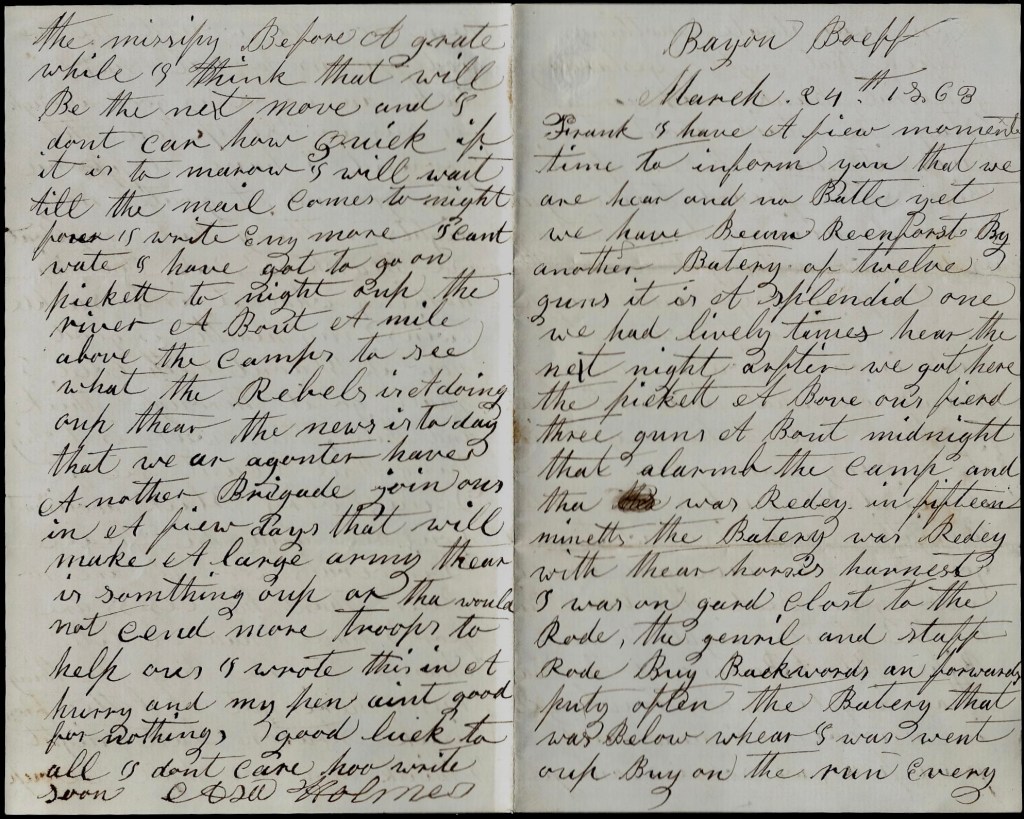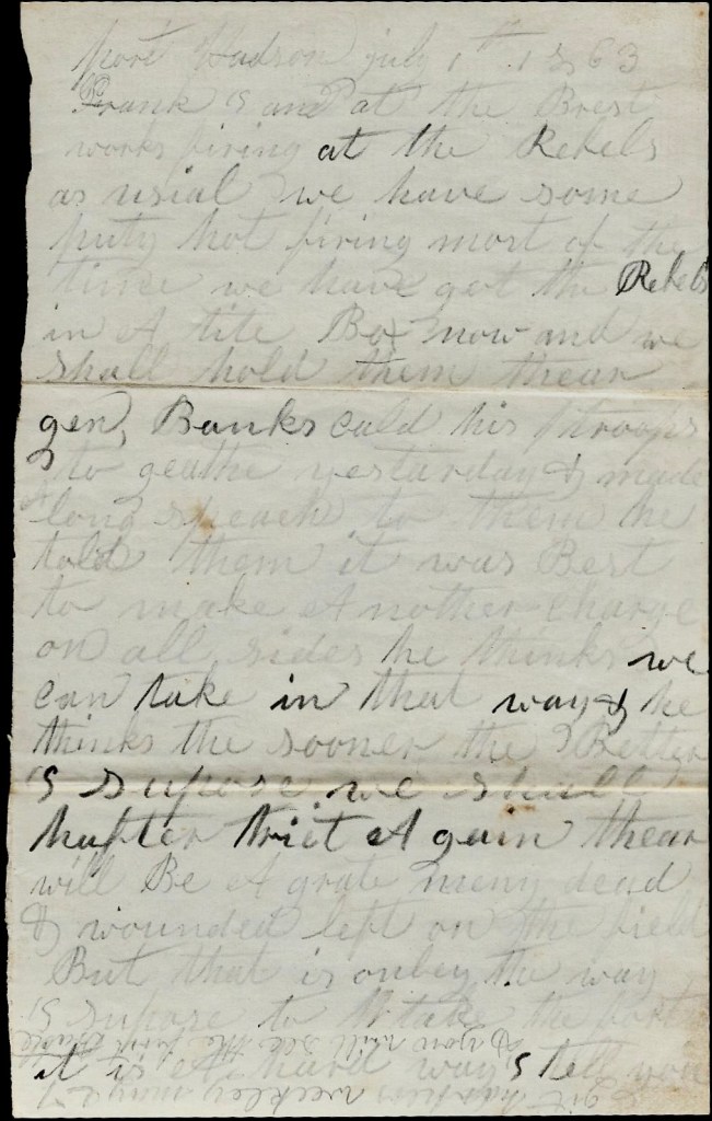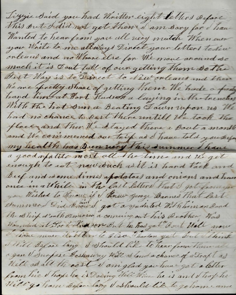 Having a few spare moments I though I would write you a few lines to let you know that I am well and as tough as a knot, although we have seen a rough time since I wrote you last. We left Baton Rouge on the 14th en route for Port Hudson. The first day we marched 15 miles and camped for the night and I had just got to sleep when orders came for us to report to Gen. Banks’ Headquarters which was about five miles so we formed in line and arched up there and as soon as we got there we had to go on guard that night, and the next morning we marched back to the regiment and stayed all day and that night I never see it rain so hard in my life. And [then] orders came for us to come into the pickets with an ambulance train which was about 4 miles and where we had to walk was in the gutter and mud and water up to your knees. And we marched to pickets and stopped for the night. I laid down and went to sleep and when I woke up, I was laying in two or three inches of mud and water. And just about that time, I thought I should like to be in Marm’s feather bed. It was awful hard work but I had a first rate time—especially when we halted.