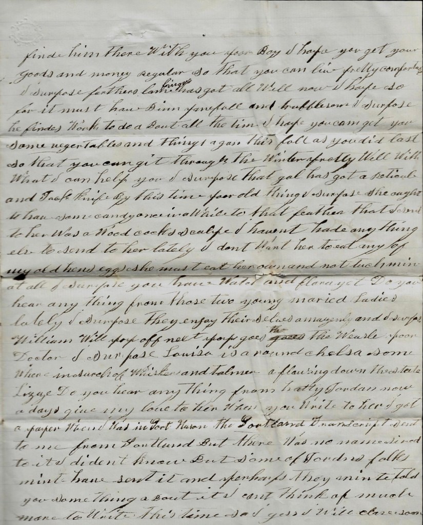 The regiment is up to Port Hudson. Charles Dresser died last Tuesday night about 10 o’clock and since I wrote you last, Amos Spofford and William Hunkins have died. I expect that the folks anticipate a great reception. All I want is to get home and then I guess I shall mind my business and stay at home. Since I have been sick, I have received letters from Uncle Eben, Aunt Maggy, Aunt Maggy Dodge, Ed Kneeland, and four from you and I shall answer them as soon as I get a little more strength. Tell Kenney to take good care of the hens for brother George is coming home in a few days.