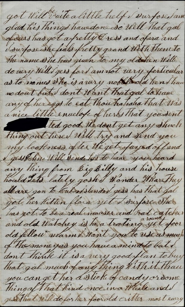 I am in good health and have been since I have been here and I hope that I shall have it while I stop here for it is an awful unhealthy place here. It’s cold nights and hot in the day time and a good many of the Boys are sick and seem to be all run out and they don’t seem to improve any. Tom Blackburn and Bill Hunkins are all run down and lok like death but the Dr. says that when they begin to get use to the climate, they will come right up.