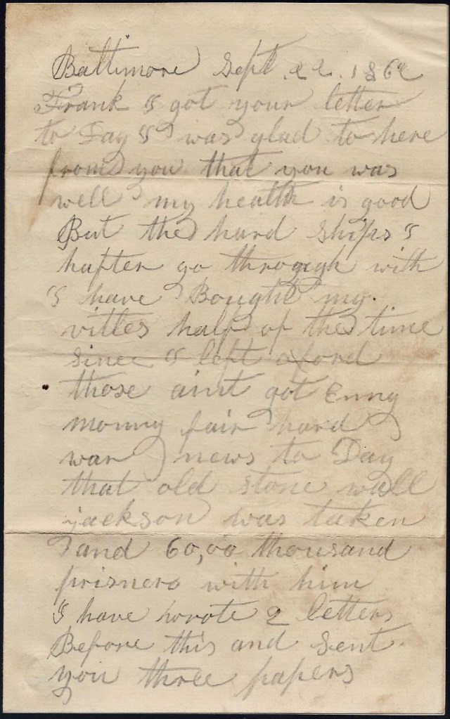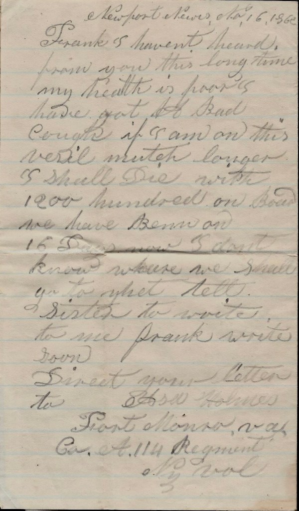 Having a few spare moments I thought I would write you a few lines to let you know that we are a going to embark today on the Propellor Jersey City for Fortress Monroe. I got that box that mother and Mrs. Pickett sent last Thursday. Tell Mrs. Pickett that Frank has lost his knapsack and all his clothes. I have got my vest and it fits me first rate and I am very much obliged to you for it.