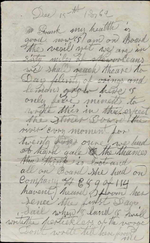Having some spare time, I thought that I would write you a few lines to let you know that I am in good health and I hope that you are the same. We left Hilton Head January 1st and arrived at Ship Island on the 15th and stopped there three days and we are now on our way up the Mississippi to New Orleans. I have had a pretty good time since I left Camp Stanton and I have seen a good many sights. While we was at Hilton Head, I saw George Hunkins, Ed Hazen, and Dennis Adams [of 1st Massachusetts Cavalry]. George Hunkins is awful sick of the army, I tell you.