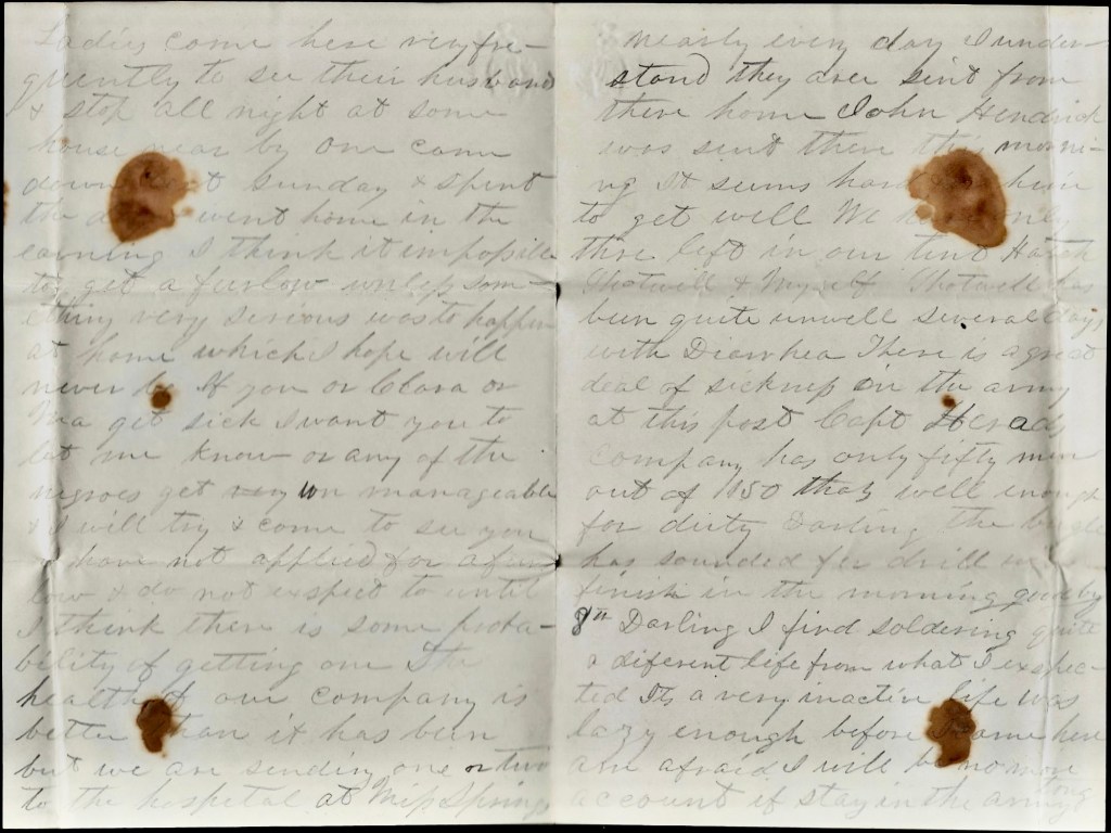[July] 8th. Darling, I find soldiering quite a different life from what I expected. It’s a very inactive life. I was lazy enough before I came here and afraid I will be no more account if [I] stay in the army long.