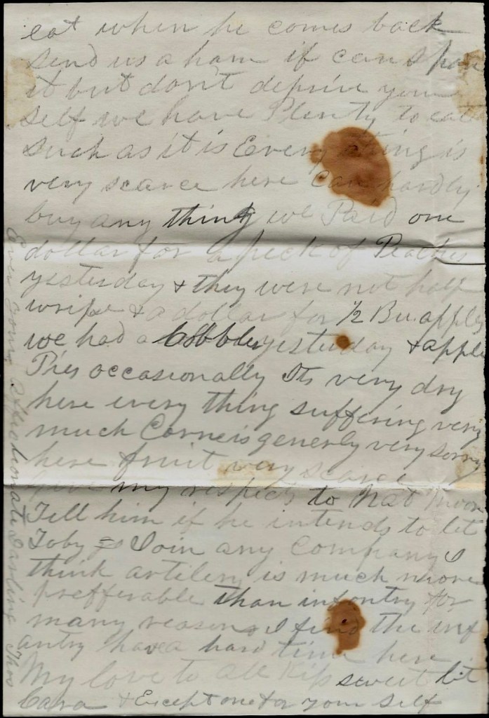 Mose [Simpson] is well. Has the cooking to do for the mess by himself. Does very well. The other two boys are both gone home sick. Expect Shotwell’s boy soon. He is to bring something to eat when he comes back. Send us a ham if can spare it but don’t deprive yourself. We have plenty to eat, such as it is. Everything is very scarce here. Can hardly buy anything. We paid one dollar for a peck of peaches yesterday & they were not half ripe, and a dollar for half bushel apples. We had a cobbler yesterday and apple pies occasionally.