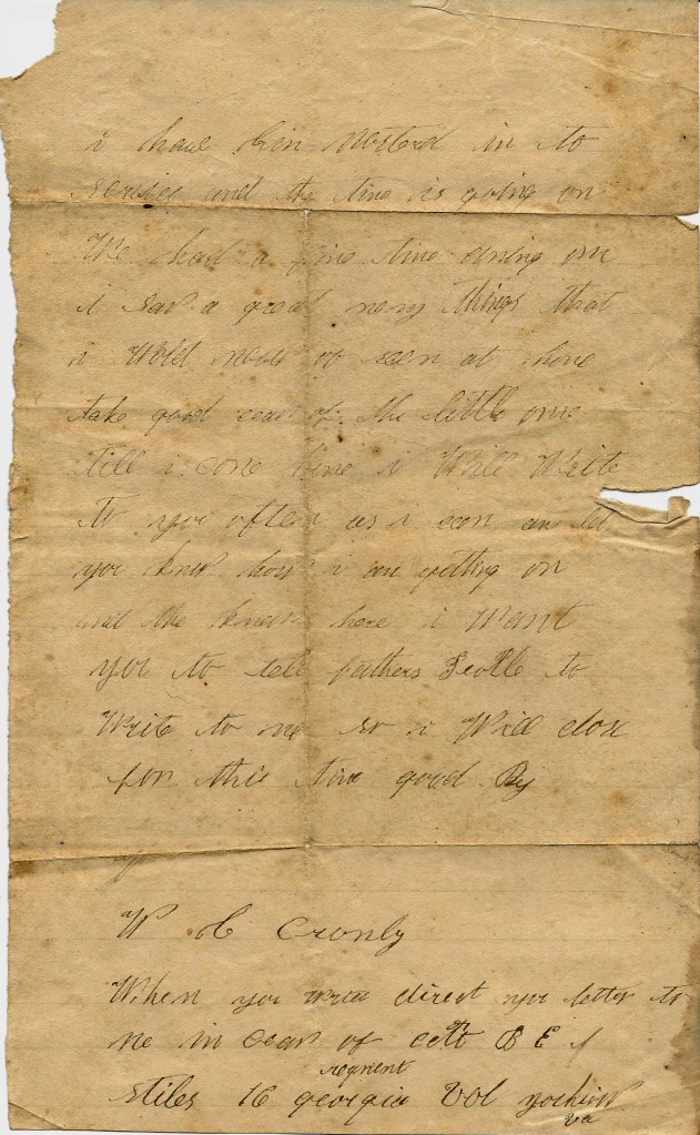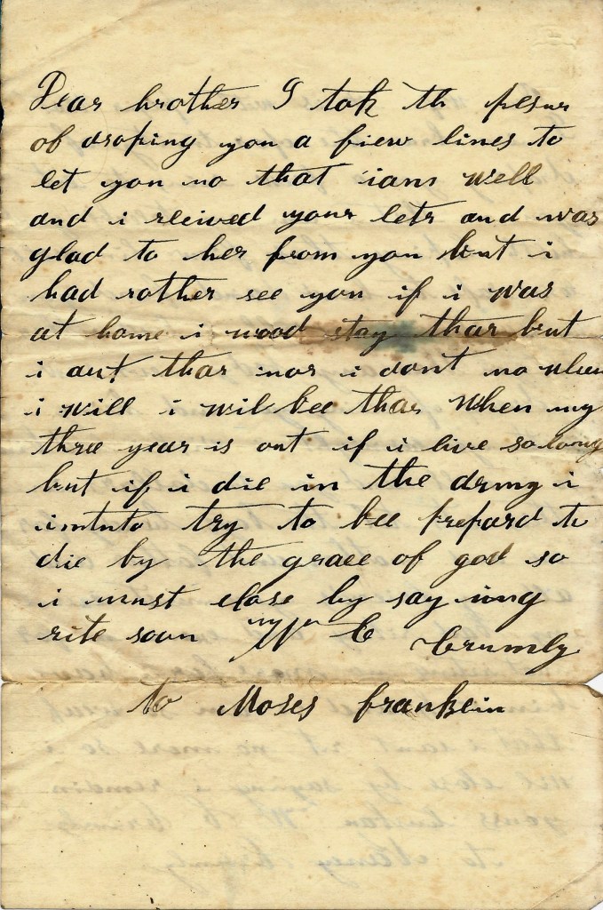 I take the pleasure of dropping you a few lines to let you know that I am well and I received your letter and was glad to hear from you but I had rather see you. If I was at home, I would stay there but I ain’t there nor I don’t know when I will be there. When my three years is out if I live so long, but if I die in the army I intend to try to be prepared to die by the Grace of God. So I must close by saying write soon. — W. C. Crumley