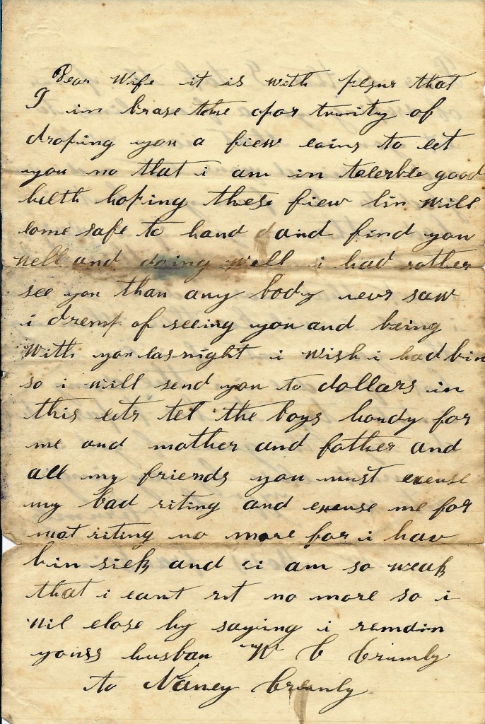 So I will send you two dollars in this letter. Tell the boys howdy for me and mother and father and all my friends. You must excuse my bad writing and excuse me for not writing no more for I have been sick and I am so week that I can’t write no more. So I will close by saying I remain your husband. — W. C. Crumley