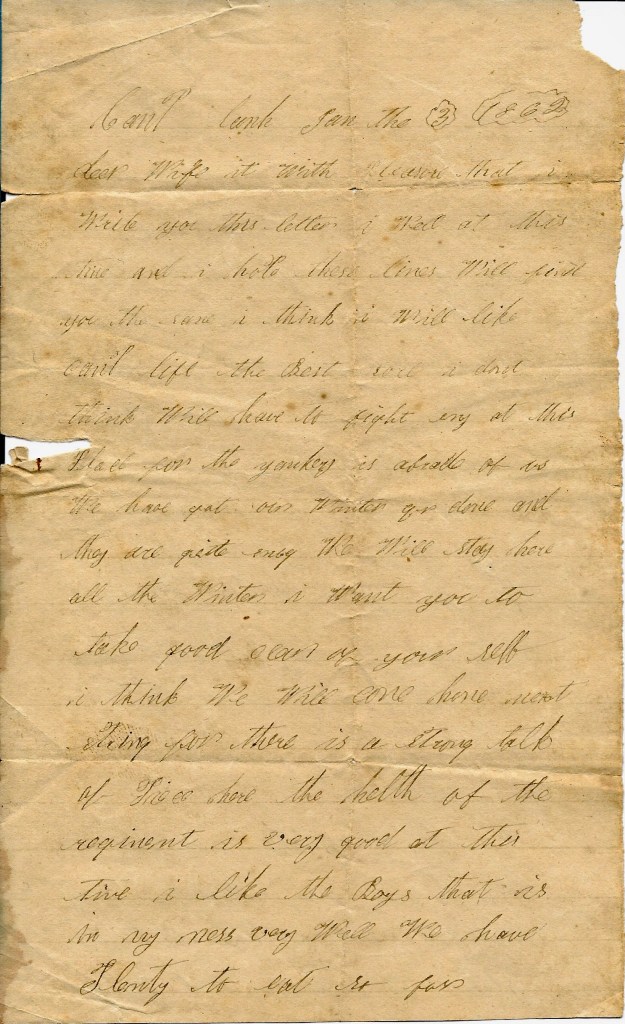 I seat myself this afternoon to drop you a few lines to inform you that I am well at present, hoping these few lines may find you also enjoying the same great blessing. The weather is tolerable cold. It snowed last night. The ground was all white this morning but it is all gone already. We have no winter quarters yet nor I don’t expect we will get any better than we have already. We have built fireplaces in our cloth tents.