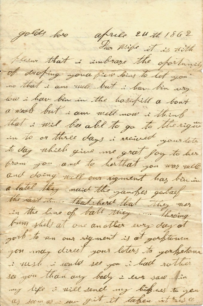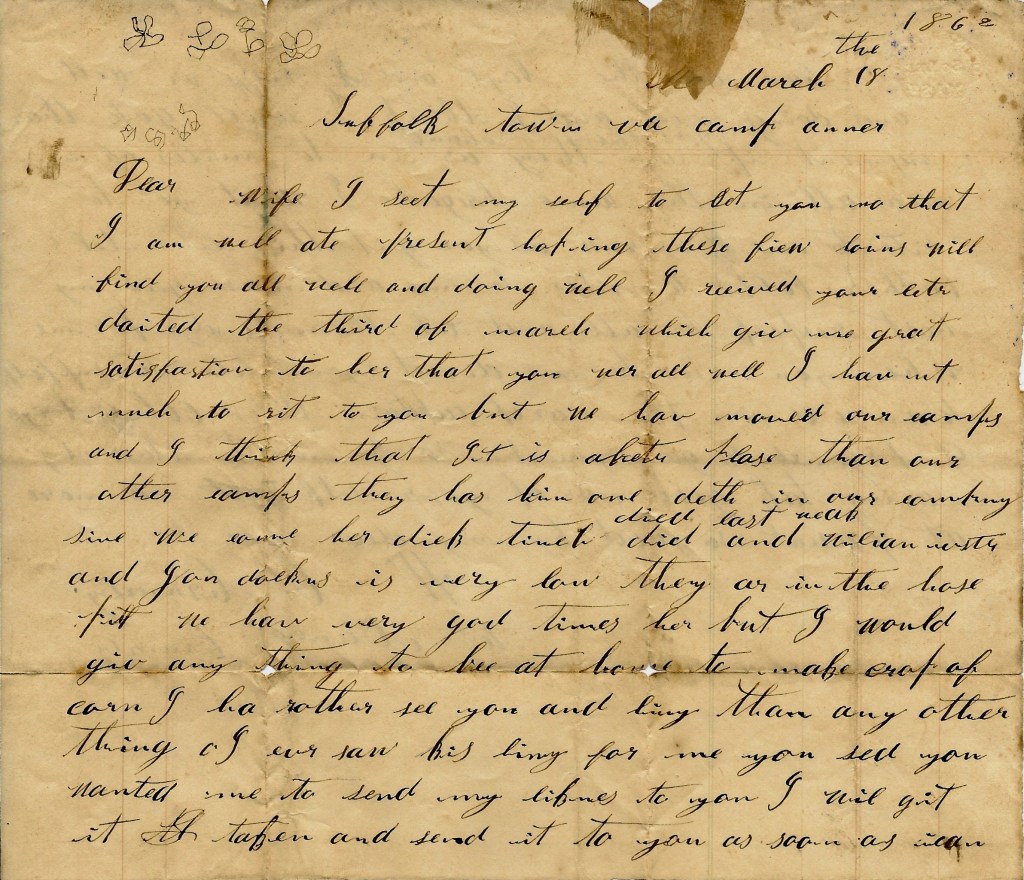 I seat myself to let you know that I am well at present hoping these few lines will find you all well and doing well. I received your letter dated the third of March which gave me great satisfaction to hear that you were all well. I haven’t much to write to you but we have moved our camps and I think that it is a better place than our other camps. There has been one death in our company since we came here. [Richard] “Dick” Tinch [Tench] died last week and William Wester [?] and John Dockins is very low. They are in the hospital.