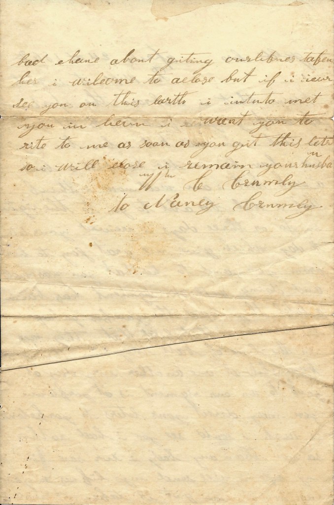 I will come to a close but if I ever see you on this earth, I intend to meet you in heaven. I want you to write to me as soon as you get this letter. So I will close. I remain your husband, — W. C. Crowley