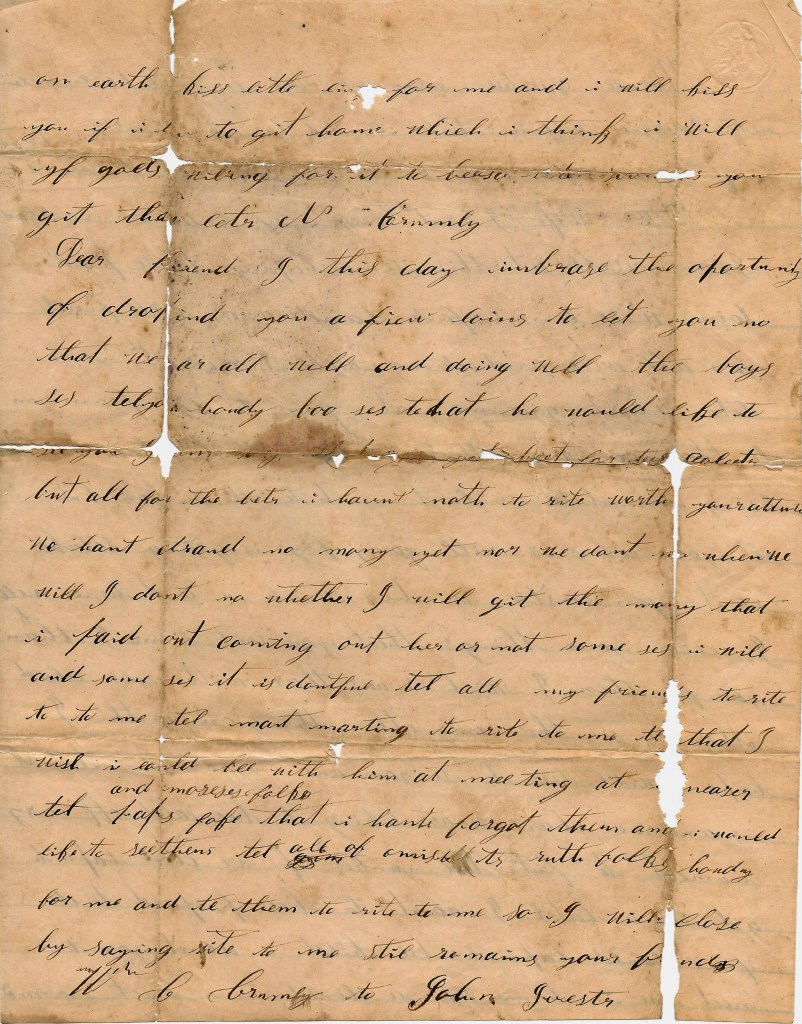 Dear friend, I this day embrace the opportunity of dropping you a few lines to let you know that we are all well and doing well. The boys says tell you howdy. Boo says that he would like to see you [paper creased] but all for the better. I hant nothing to write worth your attention. We hant drawed no money yet nor we don’t know when we will. I don’t know whether I will get the money that is paid out coming out here or not. Some says I will and some says it is doubtful. Tell all my friend to write to me. Tell Mat Marting to write to me. Tell that I wish I could be with him at meeting. Tell Pap’s and Morse’s folks that I hant forgot them and I would like to see them tell all of [ ] Ruth’s folks howdy for me and tell them to write to me. So I will close by saying write to me. I still remain your friend, — W. C. Crumley to John Ivester