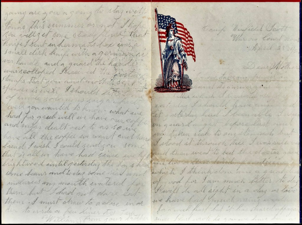 We heard yesterday that New Orleans had been taken. I hope it is so for the sooner this war is ended, the better. For my part, I should like it to end tomorrow that I could return home once more. I never knew what hardship was before I became a soldier, but I do now. I have been hungry and could get nothing to eat. I have been tired and wet through after a hard day’s march through Virginia mud and could get no dry clothes nor place to sleep except in the open fields and have stretched out upon wet ground and slept night after night. But after going through all this, I find my health still good.