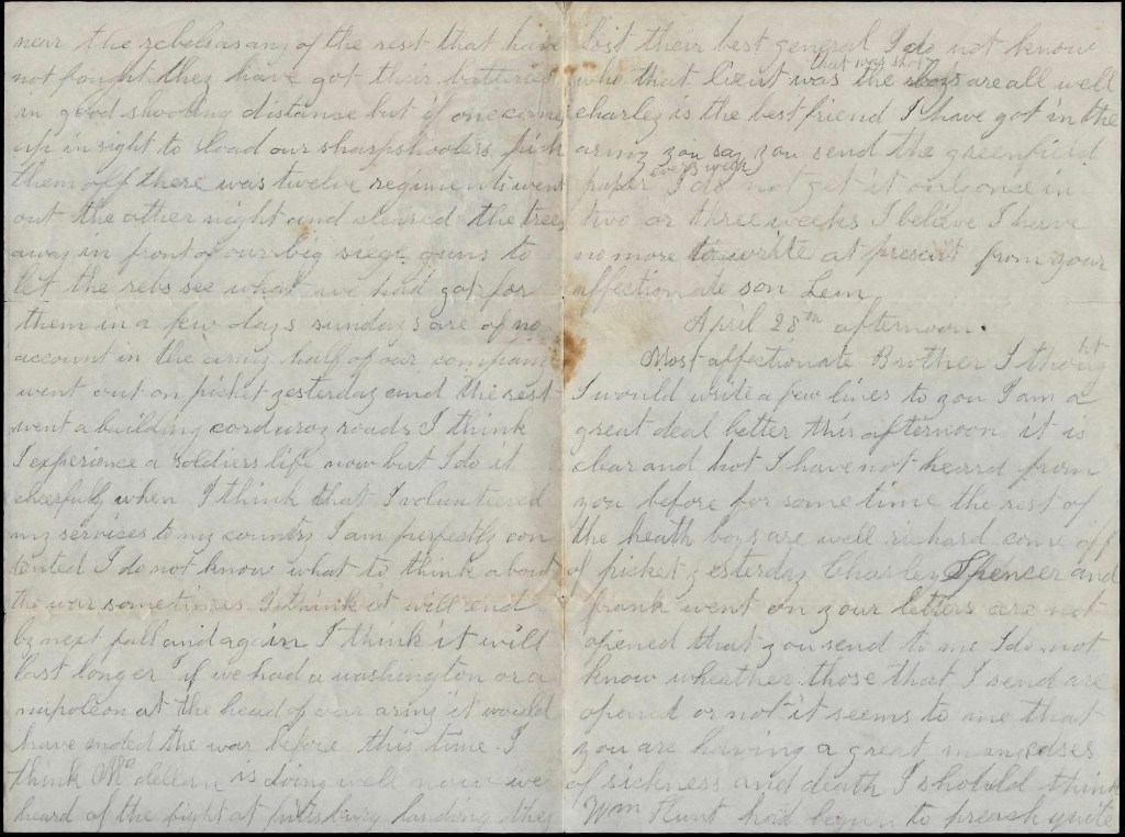April 28th. Afternoon. Most affectionate brother, I thought I would write a few lines to you. I am a great deal better this afternoon. It is clear and hot. I have not heard from you before for some time. The rest of the Heath boys are well. Richard come off picket yesterday. Charley, Spencer, and Frank went on. Your letters are not opened that you send to me. I do not know whether those that I send are opened or not.