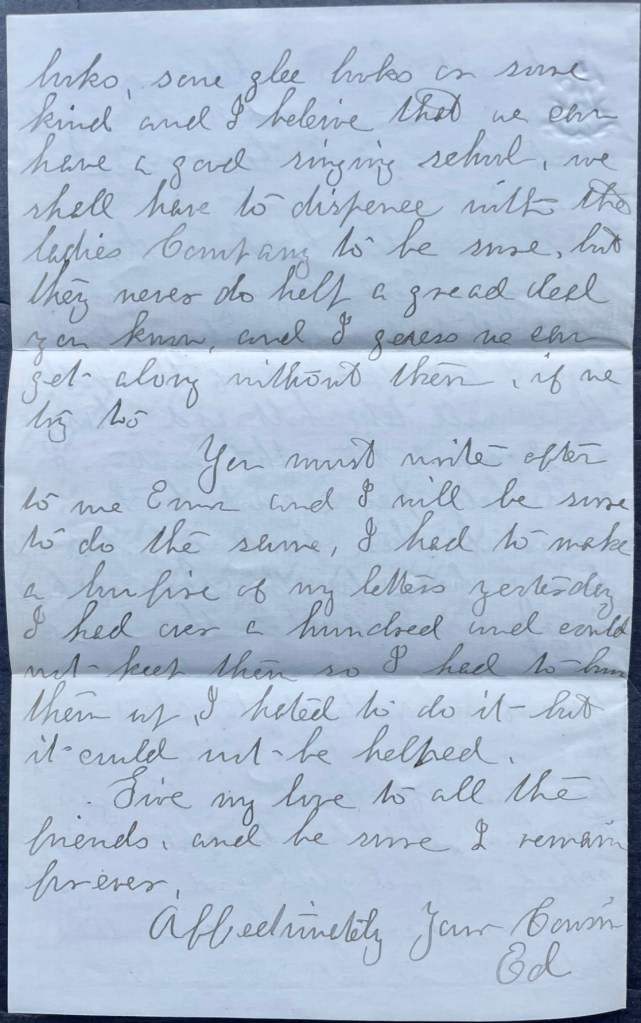 It seems to me that you are having a great many cases of sickness and death. I should think Wm. Hunt had begun to preach quite young. Are you a going to stay with Jonas this summer or not? I hope you will get some steady place. That knife I sent in Herman’s box was a small dirk knife with a German silver handle and a guard. The handle was scalloped.