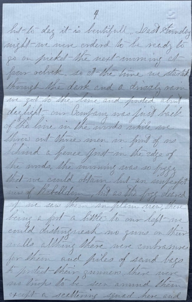 Well, we traveled all day through forts and rifle pits until night and then laid down until 3 o’clock and then went back 8 miles in the rain. It rained all day and about all night. I was wet to my skin and my coat was so wet that I could barely carry it. I had to go in the dar, to a tree, chop some wood to be warm. There was firing all day just ahead of us. In the morning we marched round to get on the east side of them but they was just one day too fast. They had to fight like the devil to win. They did fight too, I tell you.
