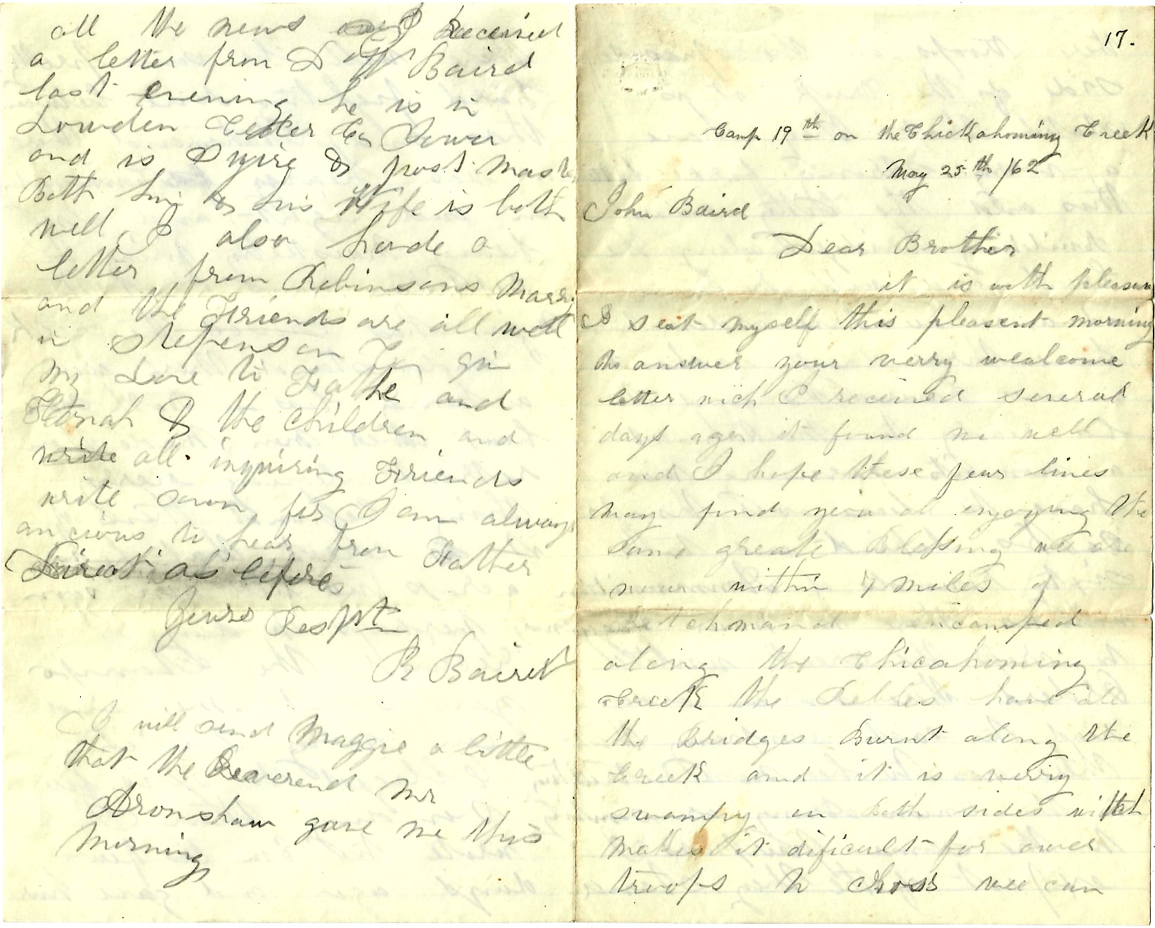 When you answer this, give me Eliza Ann Riddle’s address and I will write to her. I have not much news to write. You get the news from the army sooner than I can give it to you by letter. Give my respects to Father. I wrote to him last week. Give my respects to all the friends and write soon and give me all the news from there. You have more to write about than I have. I answered Tim’s letter a couple of weeks ago. Give me Josiah’s address. I don’t know where to write to him, I close at present by sending my respects to all your brothers, — R. Baird