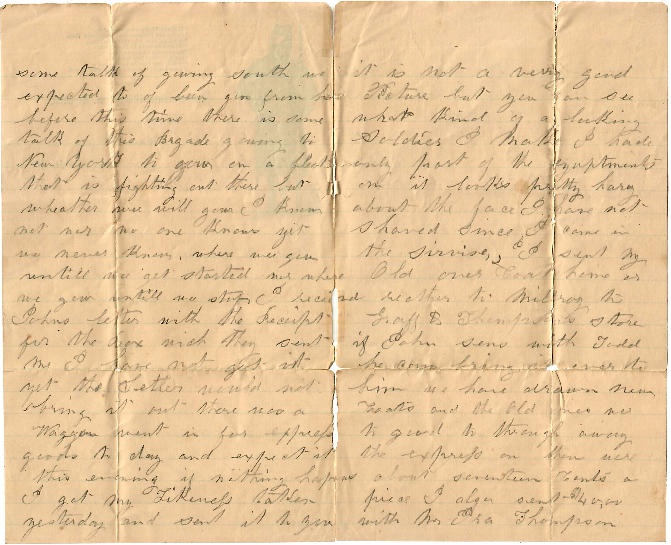 I sent my old overcoat home or rather to Millroy to Graff & Thompkin’s store. If John sends with Todd, he can bring it over to him. We have drawn new coats and the old ones were too good to throw away. The Express on them were about seventeen cents apiece. I also sent $40 with Ira Thompson and if Mr. Todd was there, he knows to send it over to John or William to keep for me.