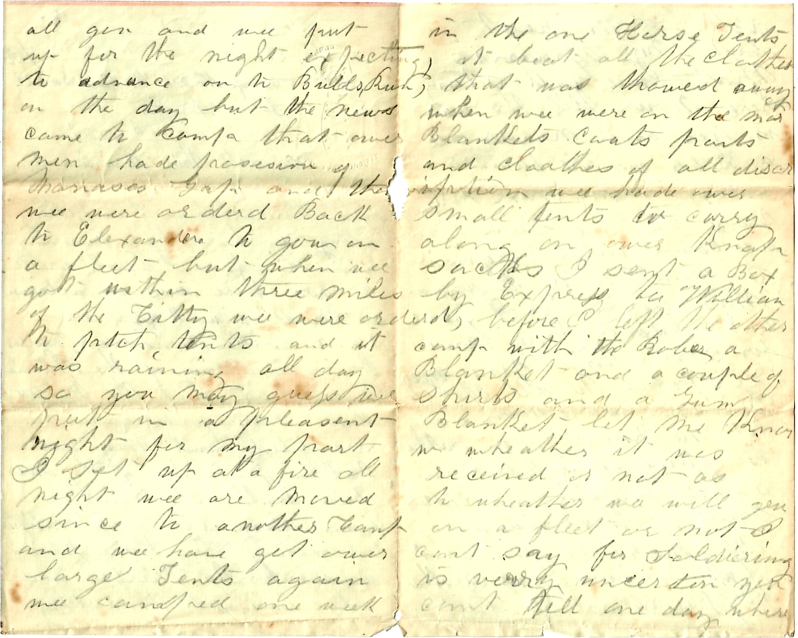 I seat myself this morning to drop you a few lines to let you know how I am getting along. We have been moving around since I last wrote to you. There was an advance made a week ago on Centreville, Manassas and Fairfax. The whole Army of the Potomac moved at once. The Rebels left their fortifications and fled and they were taken possession of by our men without firing a gun. They were well fortified at each of the three places. We went to Fairfax and when we got there, they were all gone and we put up for the night expecting to advance on to Bulls Run on the day but the news came to camp that our men had possession of Manassas Gap and then we were ordered back to Alexandria to go on a fleet. But when we got within three miles of the City, we were ordered to pitch tents and it was raining all day so you may guess we put in a pleasant night. For my part, I sat up at a fire all night. We are moved since to another camp and we have got our large tents again. We camped one week in the one horse tents. It beat all the clothes that was throwed away when we were on the march—blankets, coats, pants, and clothes of all description. We had our small tents to carry along on our knapsacks.