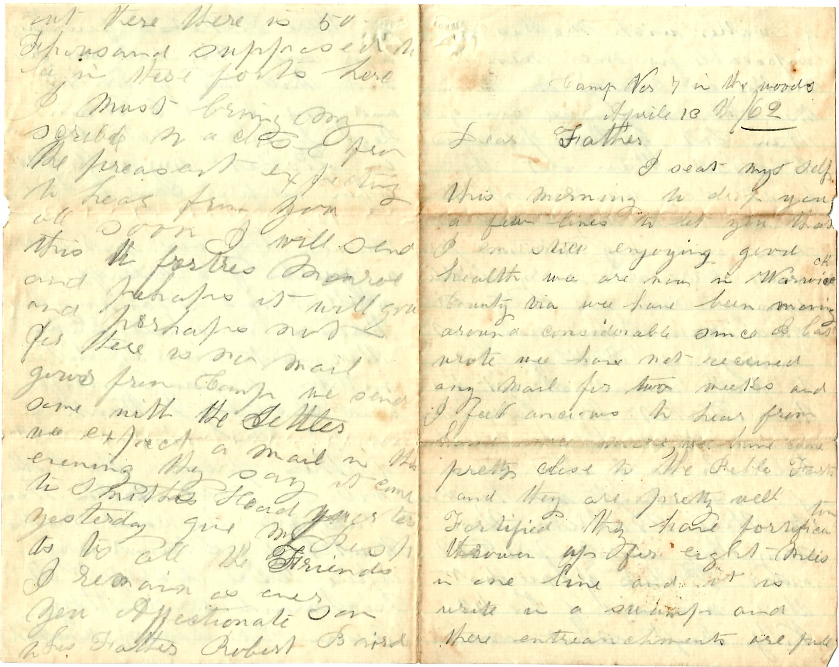Well, I must close at present for we have to go out to drill. We get good boarding here and plenty of it. Give my love to all the friends. Tell them all to write to me. That more time to write than I have. At night we can’t write and in day time we have to drill. My love to all. Yours son, — Robert