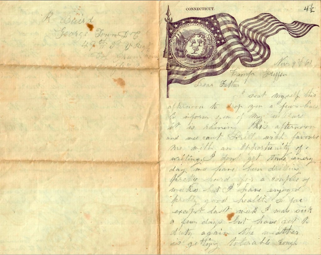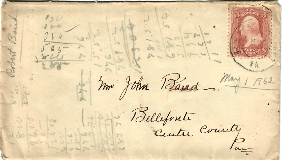 The following letters were written by Robert Baird (1831-1862), the son of William Baird (1765-1863) and Nancy Harbison (1787-1855) of Pleasant Gap, Centre county, Pennsylvania. Robert enlisted in August 1861 and was mustered in as 1st Sergeant of Co. H, 49th Pennsylvania Infantry on 24 October 1861 at Camp Griffin, Virginia. At the time of his enlistment, he was described as a 6′ 1″ tall, grey-eyed, sandy haired millwright. A family history informs us that for a couple of years before his enlistment Robert worked for John Todd who built and repaired grist mills, saw mills, and water wheels.