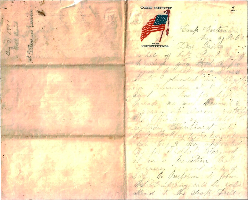 I take [this] opportunity to write to you. [I] take it from Albany. We march in the night to New York by railway in the morning & daylight. Laid there two days, then went on to Staten Island. Laid there 8 days, then [at] 4 o’clock in the afternoon, took a boat 25 miles and then took railway to the Delaware river, crossed that and a steamer to Philadelphia and a loyal place that was too. [The] saloon was a Cooper’s Shop. It was so large that we had a 11 hundred men all eat at one long table and we had everything the good. All regiments [that] pass through [Philadelphia] is fed by the corporation and all took pleasant good talk to boys.