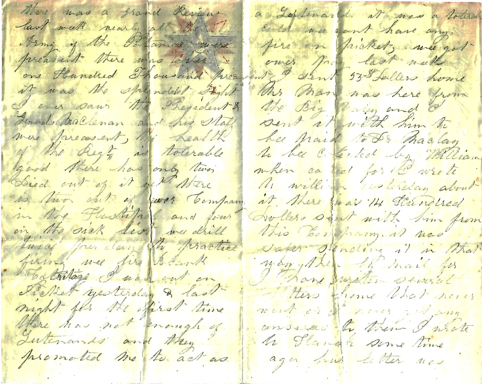 I expect there will be a forward movement before a great while. There was a Grand Review last week. Nearly all the Army of the Potomac were present. There was over one hundred thousand present. It was the splendest sight I ever saw. The President & General McClellan and his staff were present. The health of the regiment is tolerable good. There has only two died out of it yet. There is two out of our company at the hospital and four on the sick list.