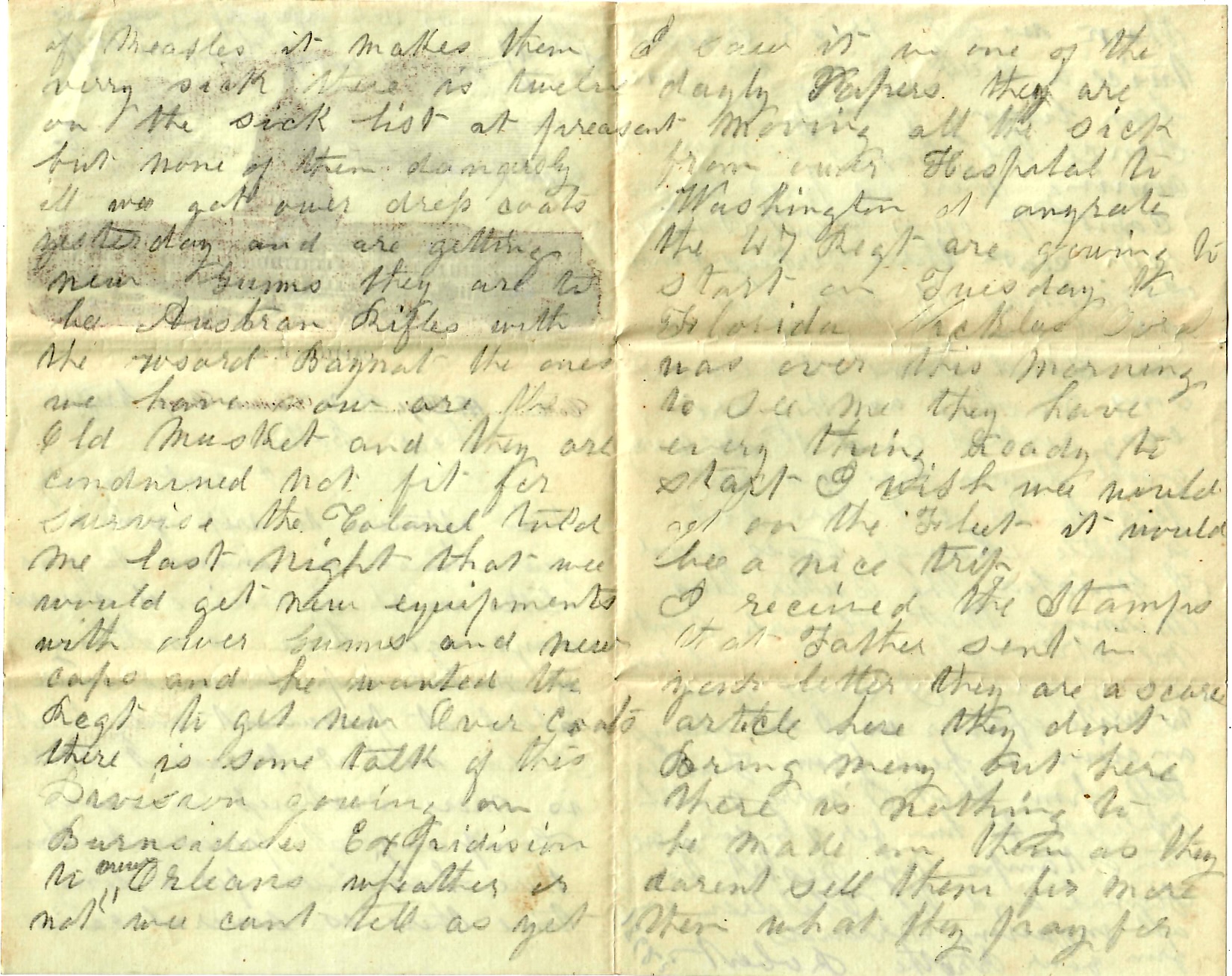 There is some talk of this Division going on Burnside’s Expedition to New Orleans. Whether or not we can’t tell as yet. I saw it in one of the daily papers. They are moving all the sick from our hospital to Washington at any rate. The 47th Regt. are goin to start on Tuesday to Florida. Nicholas Ford was over this morning to see me. They have everything ready to start. U wish we would get on the fleet. It would be a nice trip.