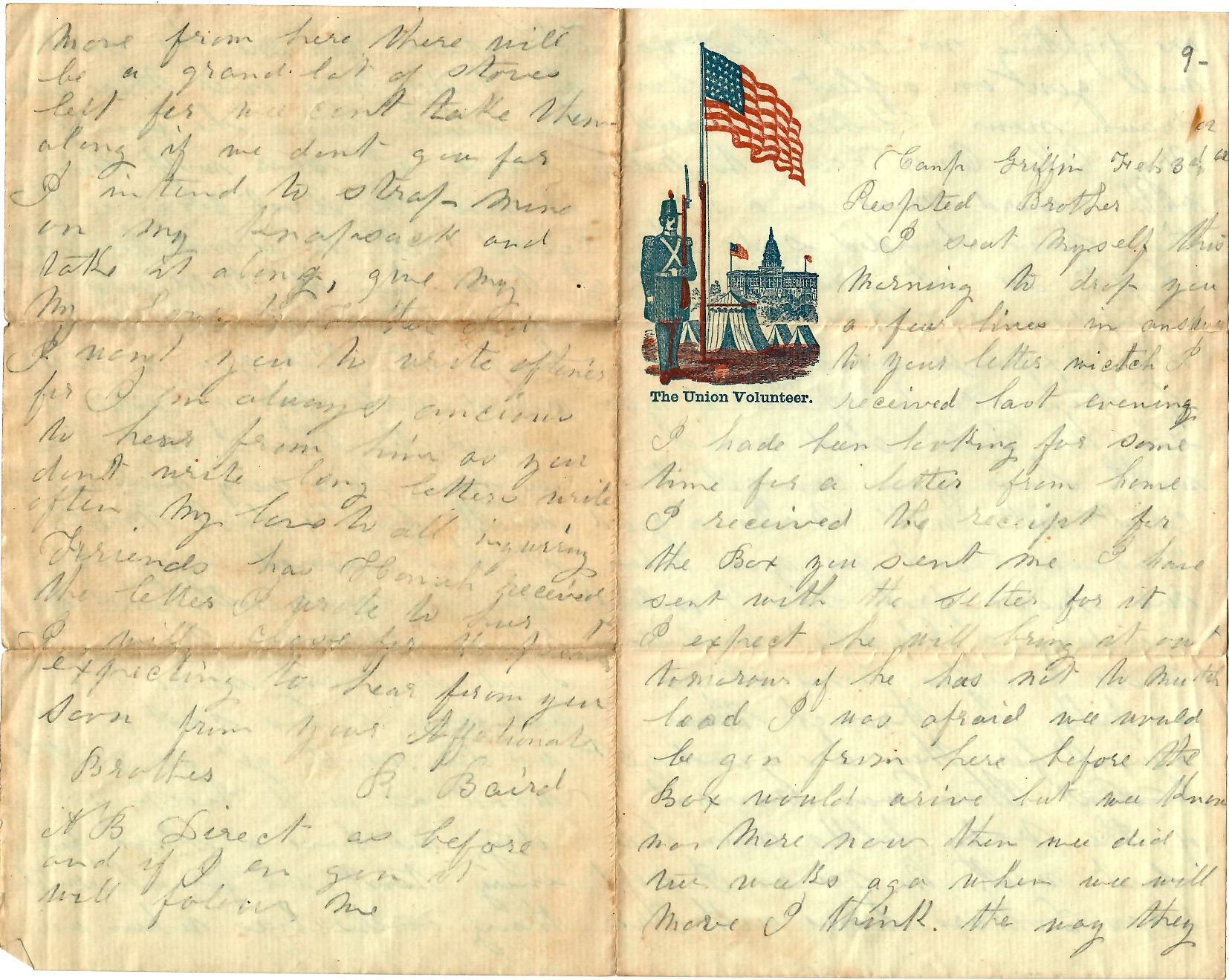 I want you to answer this soon for I have not heard from home for some time. Give my respects to all the friends. Write soon and let me know how Father is gettin along. Tell Sam I will answer his letter some of these days. No more at present but remain your brother, — R. Baird