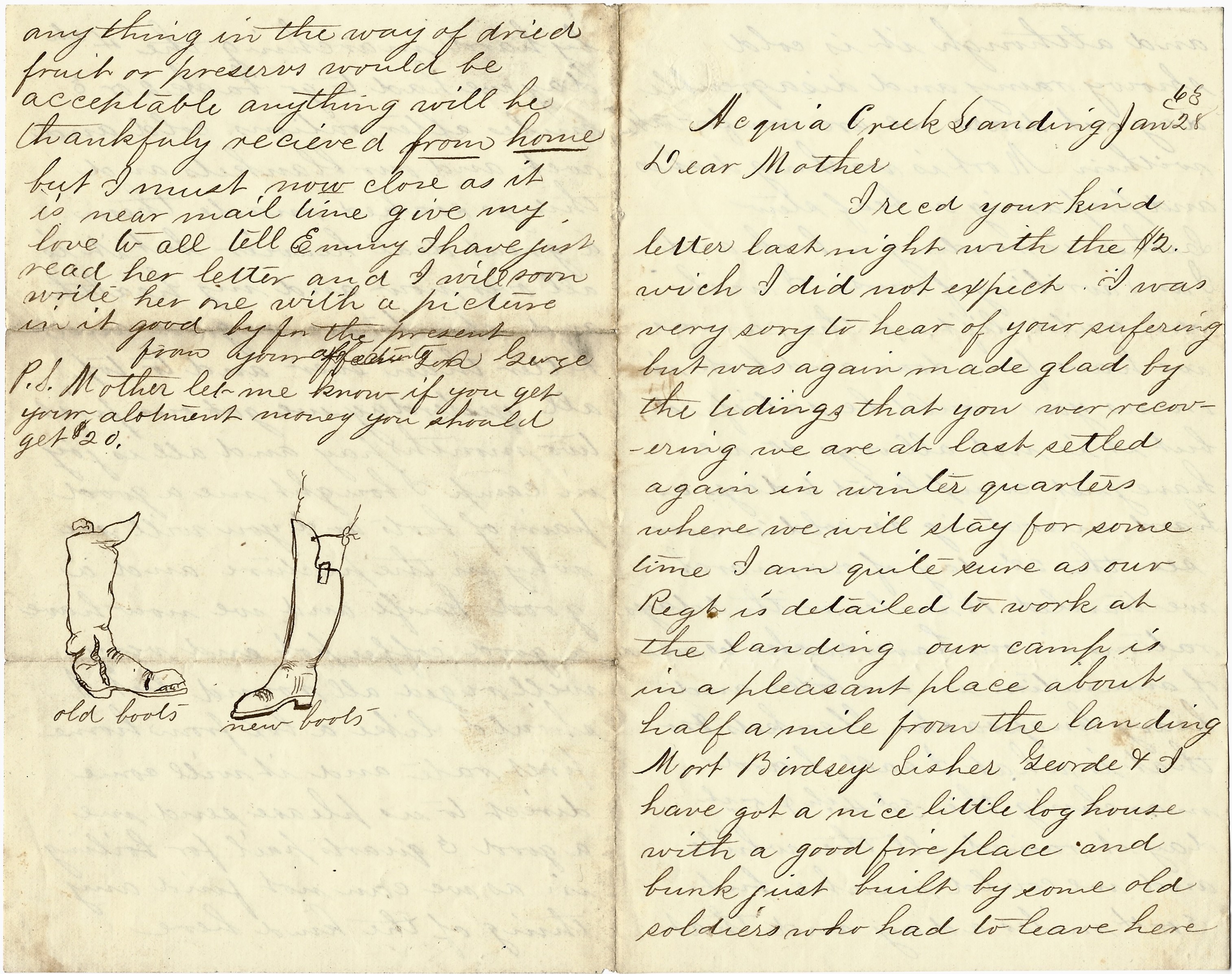 P. S. Mother, let me know if you get your allotment money. You should get $20. [sketch of boots]