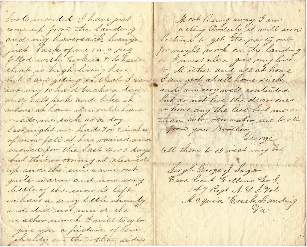 Tell them to direct my box to Sergt. George J. Sager, Care of Lieut. Collins, Co. I, 149 Regt. N. Y. S. Vols., Aquia Creek Landing, Va.