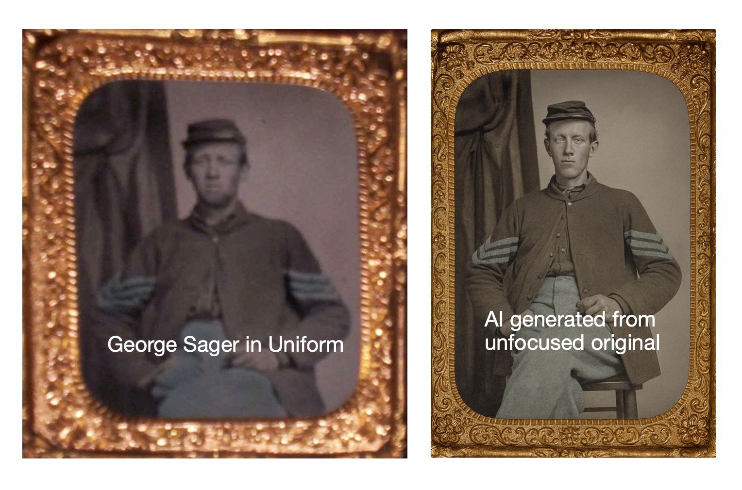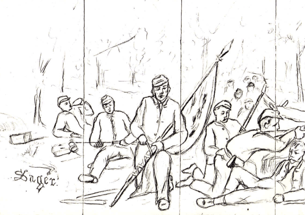 George’s parents were Jacob Sager (b. 1807), and Rebecca Smith Groot (b. 1812) of Syracuse, New York. Many of George’s letters have been published on the internet which may be found at 149th monument at Gettysburg. George apparently often included sketches in his letters to his family. He is credited for having originated the idea for a bronze statue on the regimental monument on Culp’s Hill at Gettysburg (and also at Syracuse) which depicts Sergt. Lilly of the 149th New York “Mending the Flag.”
