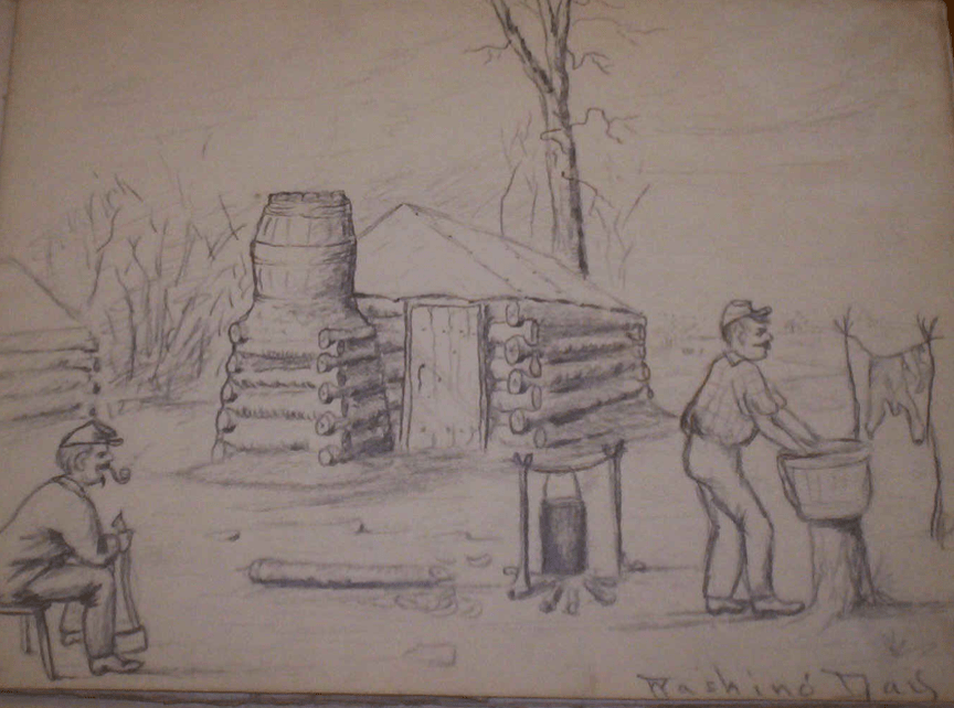 A self portrait of the author, Augustus B. Frazer. He has captioned it: “Ye party as he appeared on guard duty. Thinks he would a heap rather be with his frow [at] home living in quietude & repose. Hour two in the morning taken on the spot by our Special Artist.”