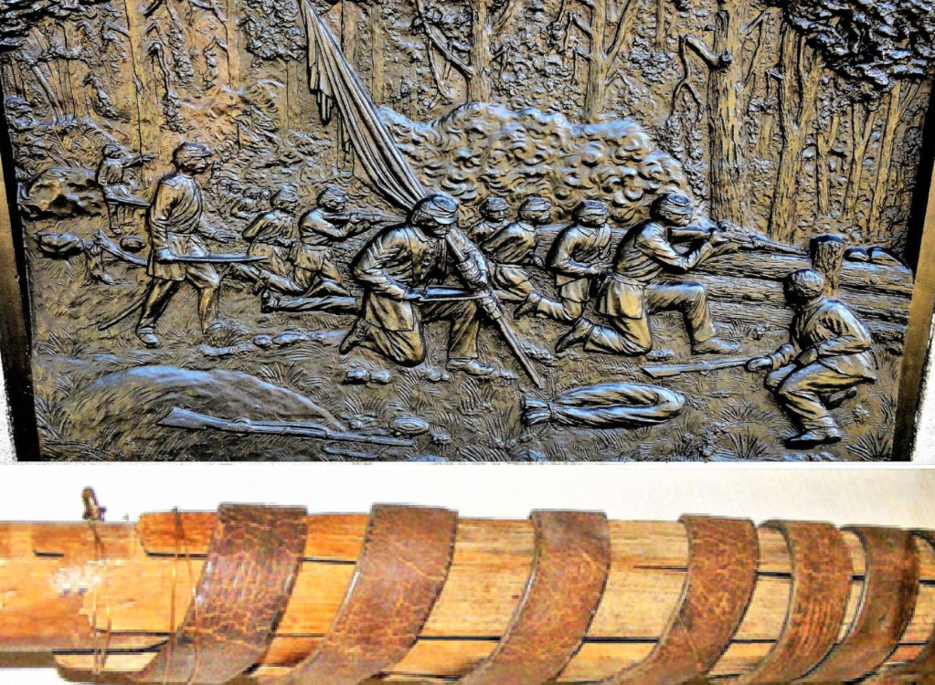 The brass relief depiction of Sgt. Lilly mending the flag on Culp’s Hill and the actual flagstaff, still bound together with ammo box slats and Lilly’s knapsack strap.