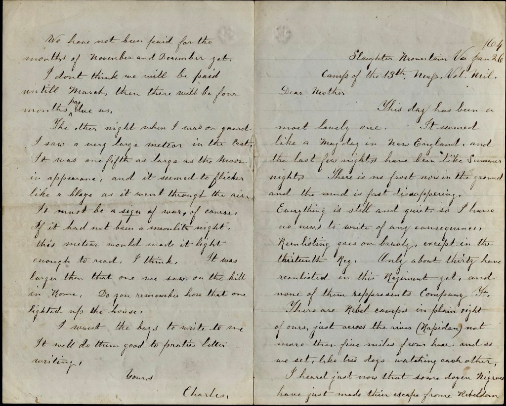 There are Rebel camps in plain sight of ours just across the river (Rapidan) not more than five miles from here and so we sit, like two dogs watching each other. I heard just now that some dozen negroes have just made their escape from Rebeldom but were fired into by the Rebels when crossing the river and some of them wounded and drowned. They say that they had nothing to live on through the winter. Lee’s army, they say, are going north again in the spring to get supplies.
