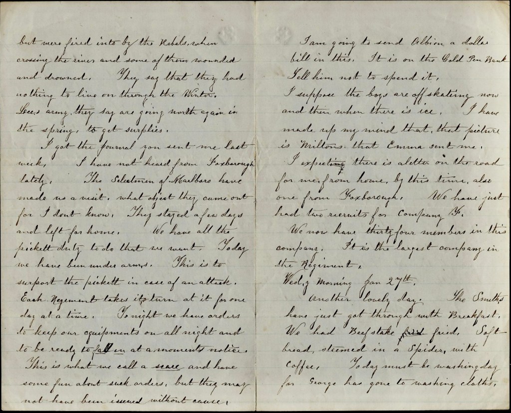 I got the Journal you sent me last week. The selectmen of Marlboro have made us a visit. What object they came out for, I don’t know. They stayed a few days and left for home. We have all the picket duty to do that we want. Today we have been under arms. This is to support the picket in case of an attack. Each regiment takes its turn at it for one day at a time. Tonight we have orders to keep our equipments on all night and to be ready to fall in at a moments notice. This is what we call a scare and have some fun about such orders but they may not have been issued without cause.