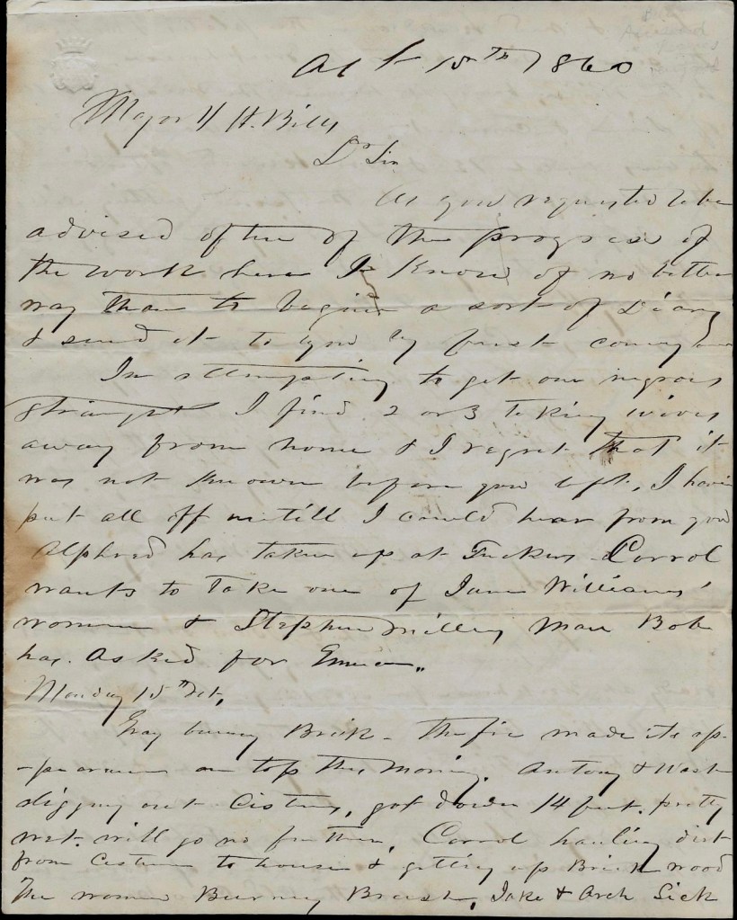In attempting to get our negroes straightened, I find 2 or 3 taking wives away from home & I regret that it was not known before you left. I have put all off until I could hear from you. Alfred has taken one of Jane Willians’ women & Stephen Miller’s man Bob has asked for Emma.