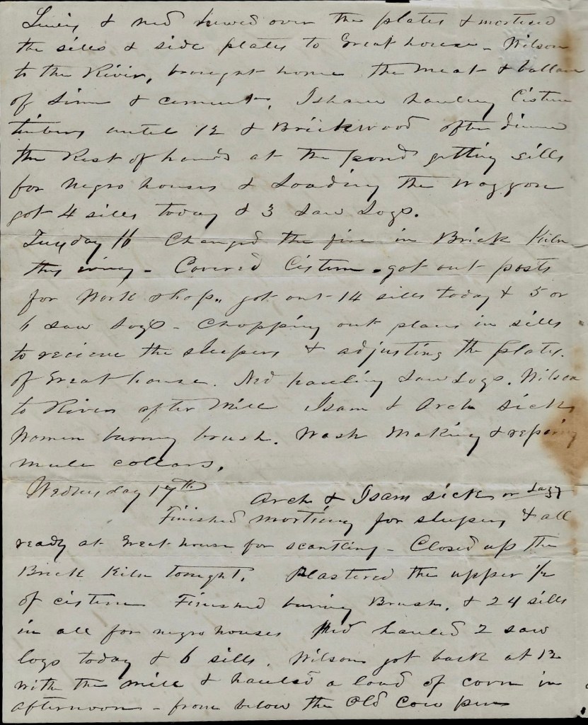 Wednesday 17th Arch & Isam sick or lazy. Finished mortising for sleepers & all ready at Great house for scantling. Close up the Brick kiln tonight. Plastered the upper half of cistern. Finished hauling brush & 24 sills in all from negro houses. Ned hauled 2 saw logs today and six sills. Wilson got back at 12 with the Mill and hauled a load of corn in afternoon from below the old cow pen.