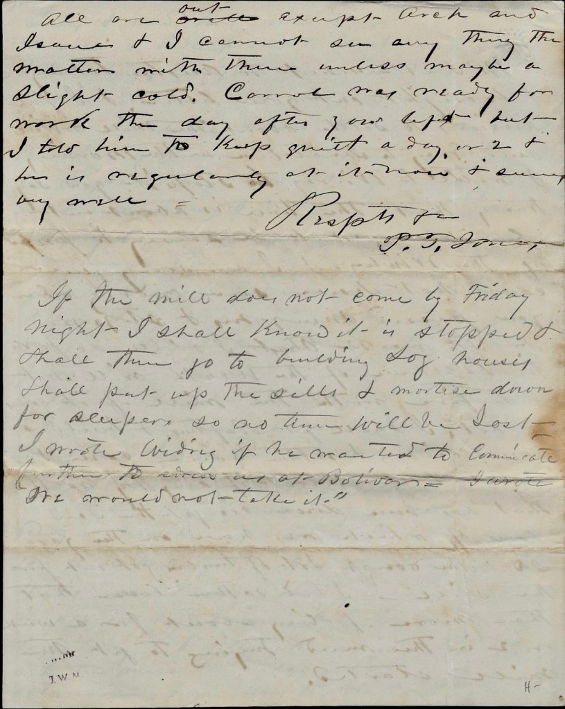 If the mill does not come by Friday night, I shall know it is stopped and shall them go to building log houses. Shall put up the sills & mortise down for sleepers so no time will be lost. I wrote Widrig if he wanted to communicate further to address us at Bolivar. I wrote we would not take it.