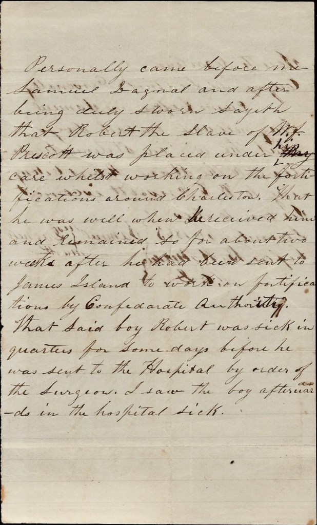 Personally came before me Samuel Dagnal and after being duly sworn sayeth that Robert the slave of W. F. Prescott was placed under his care whilst working on the fortifications around Charleston. That he was well when he received him and remained so for about two weeks after he had been sent to James Island to work on fortifications by Confederate authority.