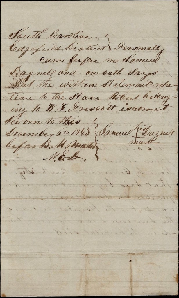Personally came before me Samuel Dagnell and on oath says that the within statement relative to the slave Robert belonging to W. F. Prescott is correct. Sworn to this December 6th 1863, before B. M. Martin, M. E. D.